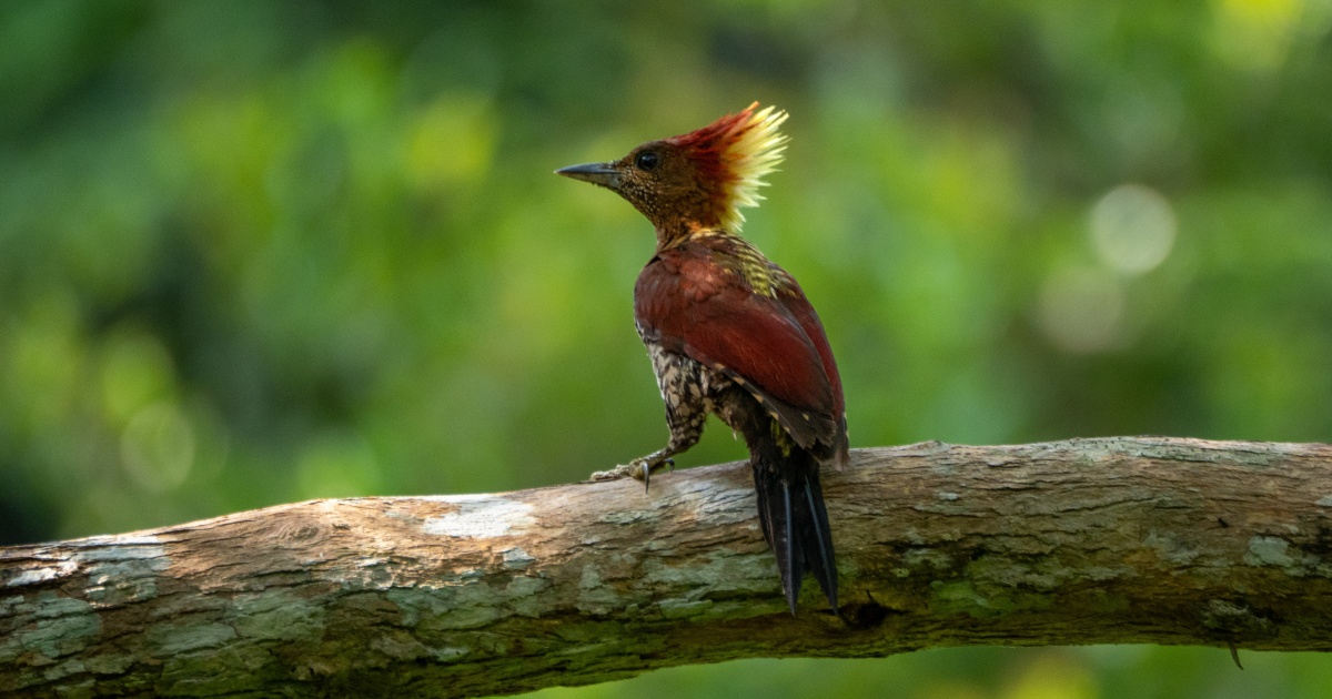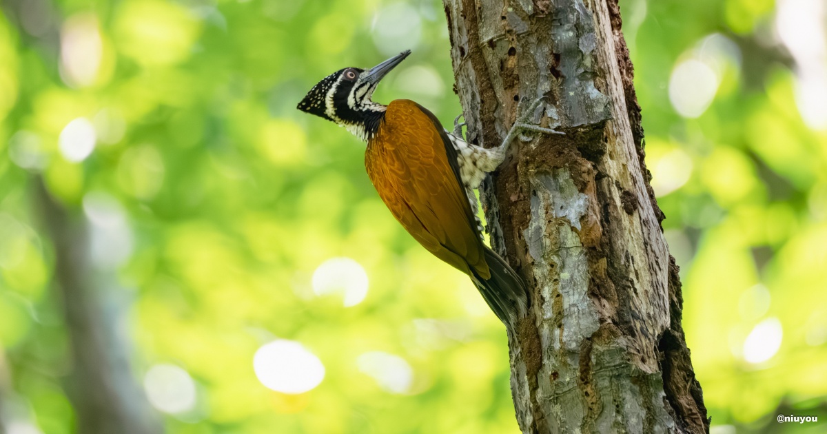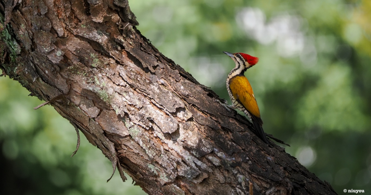 金背三趾啄木鸟(Dinopium javanense)是新马常见的城市野鸟,黑白相间的条纹加上金翼与红背,非常显眼,尤其成熟雄鸟头顶红冠,每次出现都会伴随嘎嘎嘎嘎嘎嘎机枪扫射式的激昂叫声,呼唤同伴。