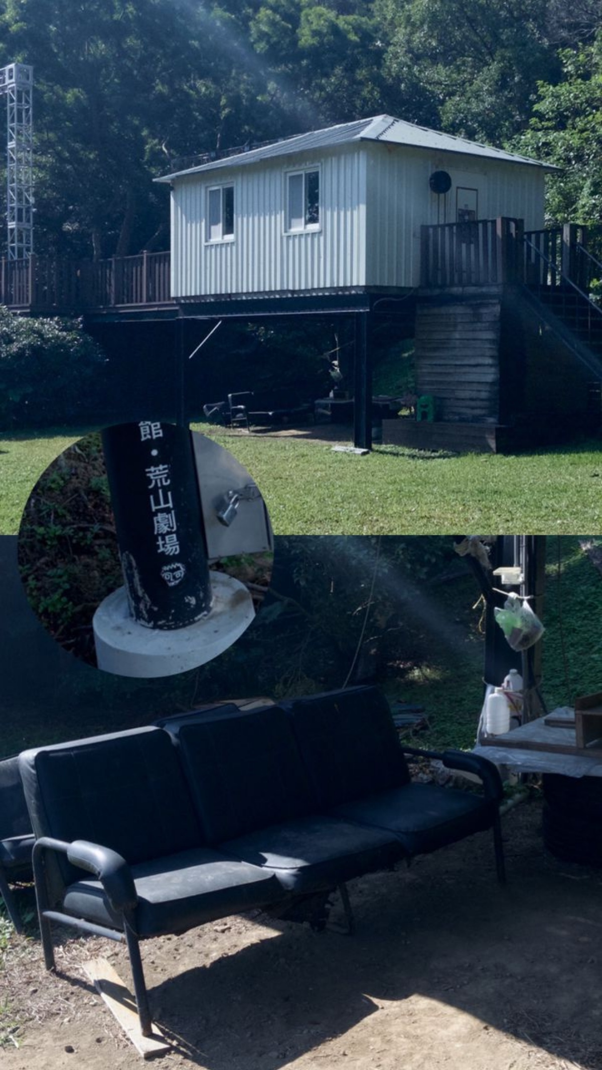 午后的荒山剧场很安静,小小社办的门上贴着乐团海报,大树阴影包围侧边的舞台和观众席。棚子下放着一个积尘的黑色沙发,忍不住走上前去摸一摸,想象数年前仍青涩的乐团成员们在一起Jamming,或坐在沙发上弹电吉他。
