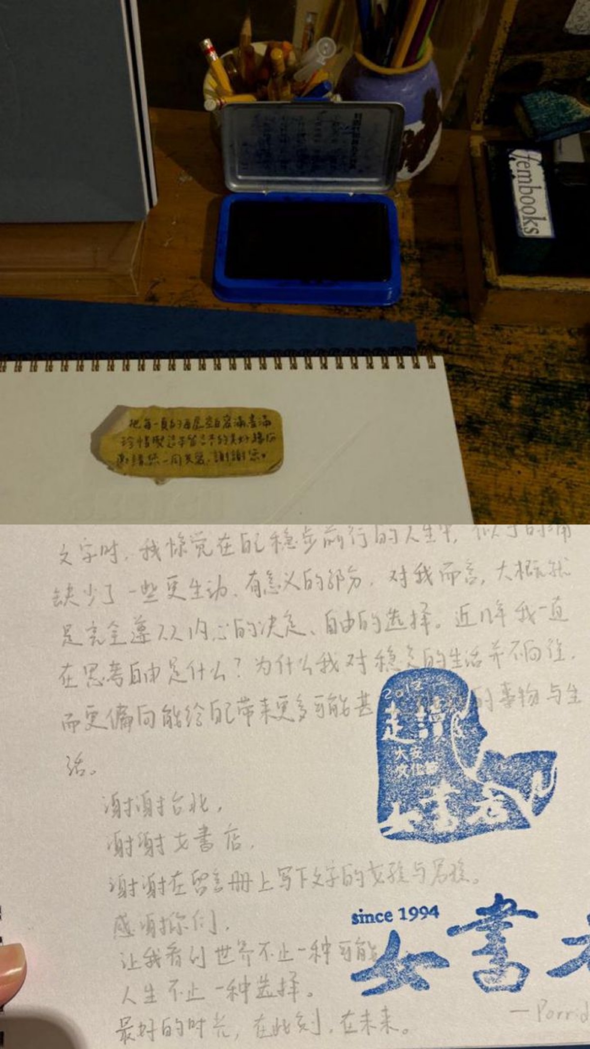 这次拜访也并非一无所获。女书店有厚厚好几本留言册,里头密密麻麻都是简体字,写着对岸女性对这个地标的向往,以及台湾独立音乐对她们青春的影响,开启我看待女巫店的另一个角度。留言册中不断出现安溥的名字和歌词,〈最好的时光〉、〈玫瑰色的你〉,忍不住坐下来翻阅了好久,竟然在其中读到亲切感。