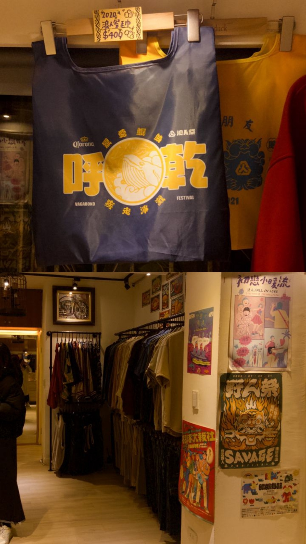 古着店中的音乐祭毛巾与海报。(图片来源:作者提供)