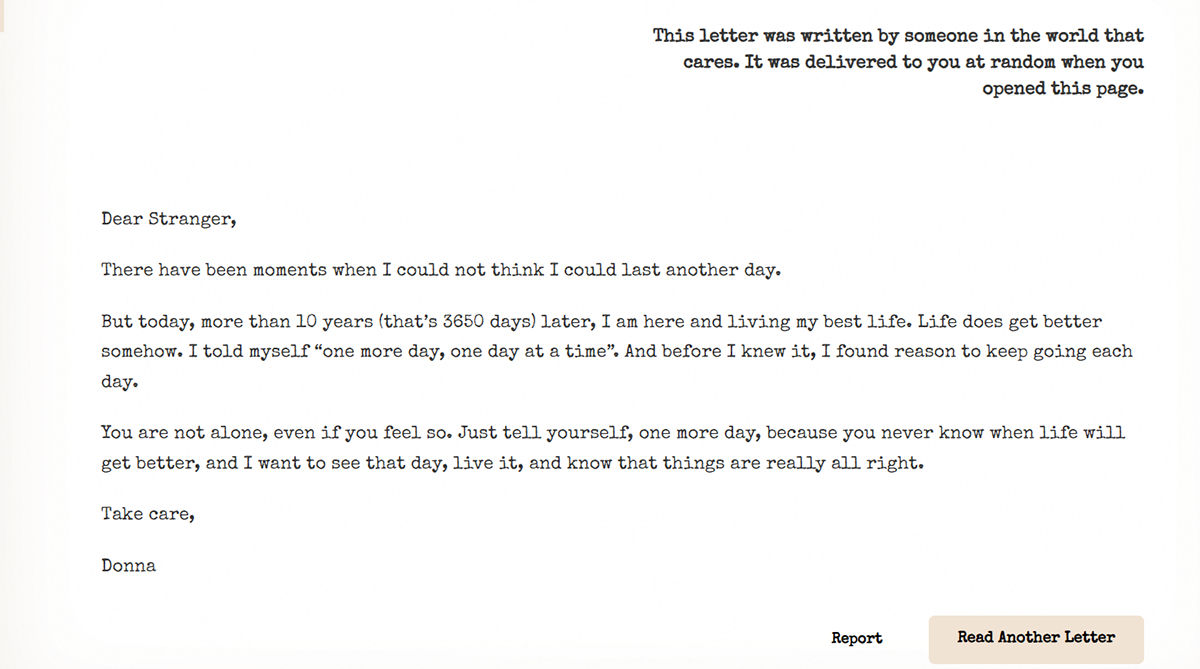 2026年初,英国的心理健康活动推广者,本·韦斯特(Ben West)成立了网站,发起了“Reasons to Stay”的自杀防治项目,邀请世界各地的人们匿名撰写带着善意的信件,陪伴与鼓励受苦的人。受苦的人,则可通过网站,选择自身熟悉的语言,来阅读这些来自陌生人的关怀,以感受到暖意与支持。