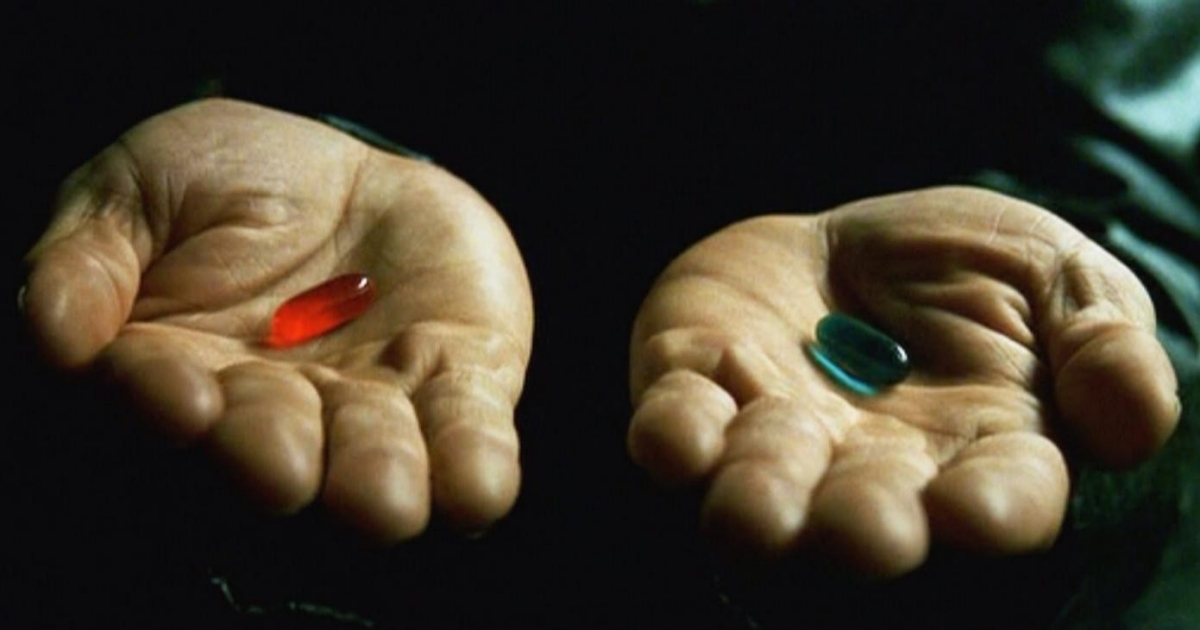 红药丸和蓝药丸是源自电影《黑客帝国》的概念,比喻两种不同极端的选择。(图片来源:网络)