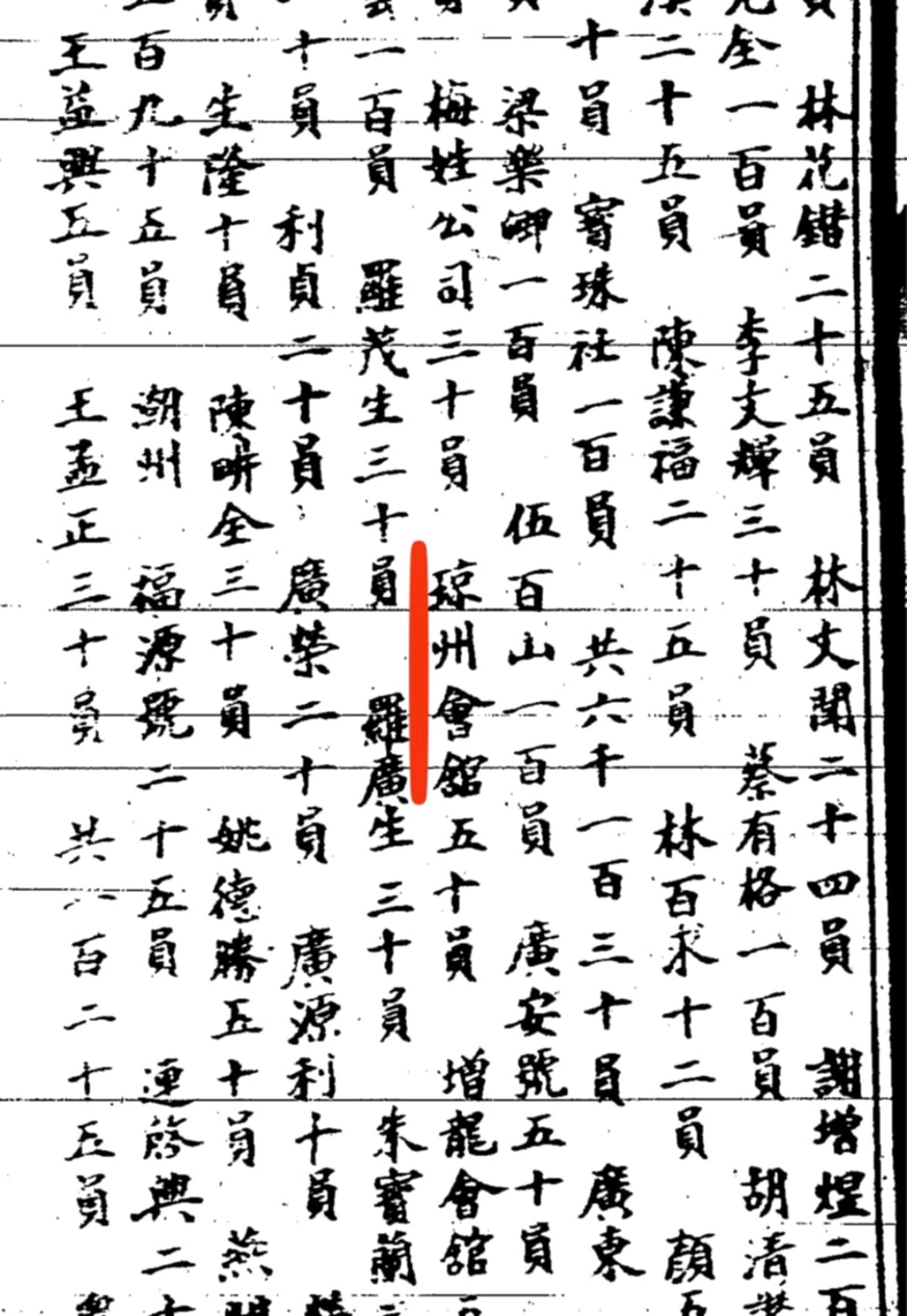 此外,随着新史料的发现,部分论述亦有再行补充之必要。作者在第八章引述谢诗坚的说法,谓:“槟城海南会馆据说是海南人在马来西亚最早建立的天后宫,其创建应在1867年或更早,但至1925年才将天后宫正名为琼州会馆。也就是说,槟城海南会馆是先立宫庙,后创建会馆的”。 11 其立论基础在于:槟城天后宫于1925年始“正名”为琼州会馆。然而此说在叙述上颇为含混。所谓“正名”,究竟意味着此前并无“琼州会馆”之称,还是仅在1925年才开始使用?遗憾的是,翻查谢诗坚原文,亦未见清晰交代,仅云:“根据《槟城琼州会馆馆史》,槟城琼州会馆之名,实始于1925年”。