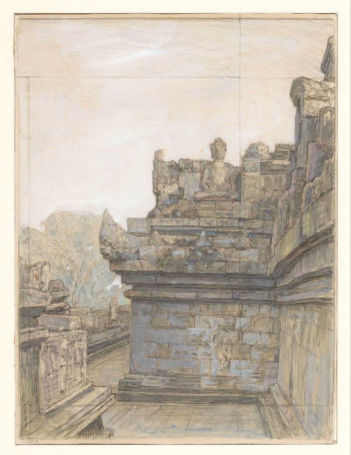 图九:Jan Veth 绘制的婆罗浮屠一隅。(图片来源:作者)