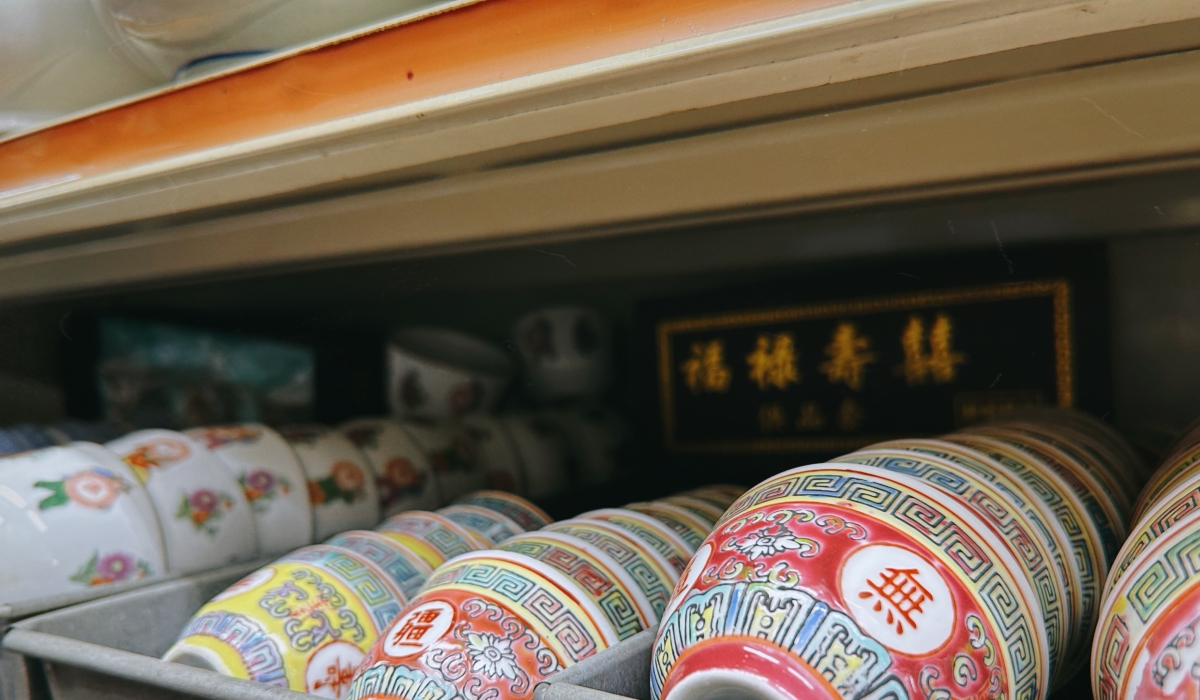 在南洋地区,除了充满热带风情的娘惹瓷,最为常见的便是万寿无疆瓷。与身份尊贵的娘惹瓷相比,显得更为平民化,几乎每家的碗橱中都丢着几只类似的碗盘。万寿无疆瓷属于粉彩瓷的一种,也是由景德镇烧制,胎质细腻坚实,较为常见的釉色有胭脂红、松石绿和娇黄三种。