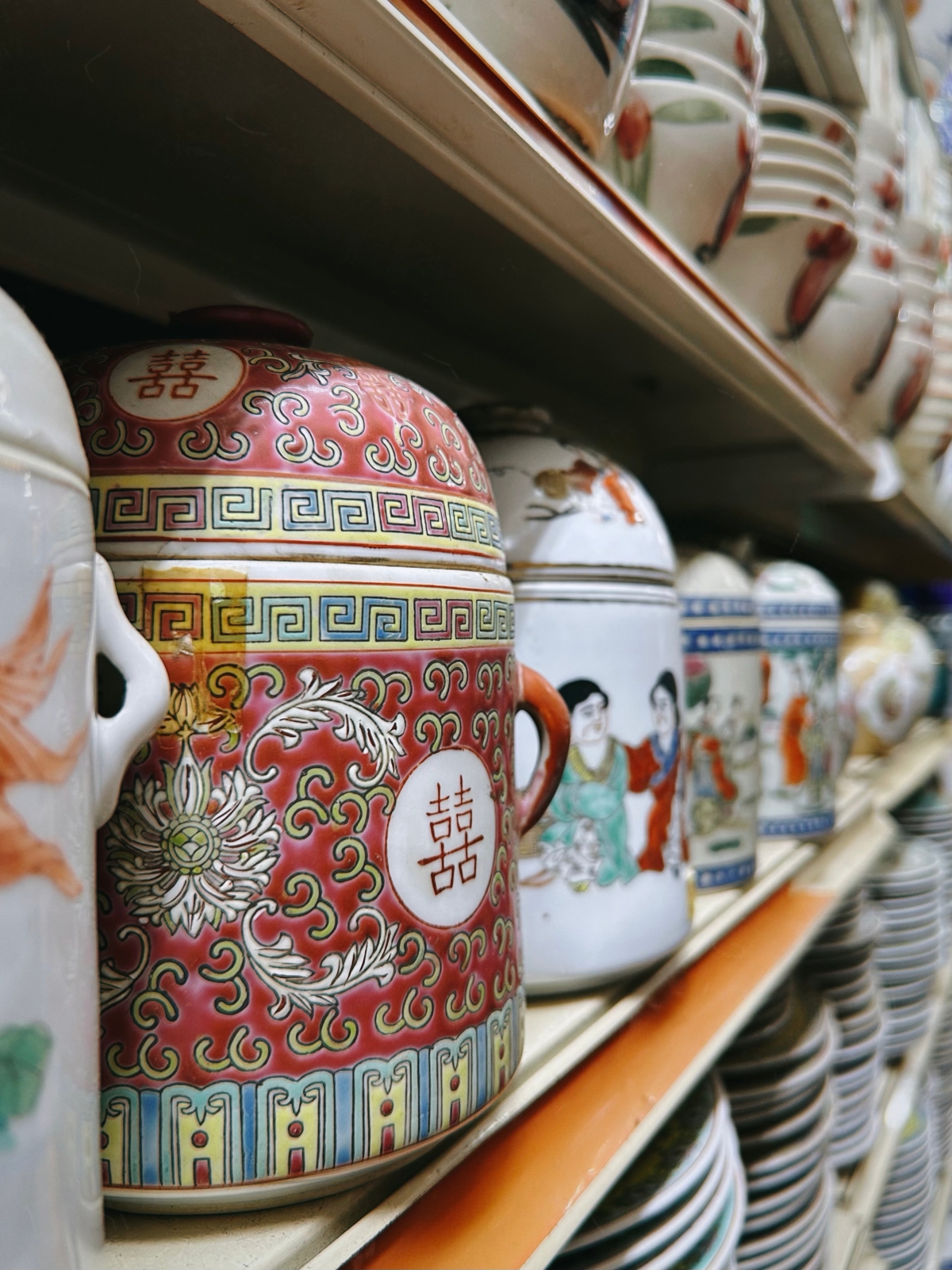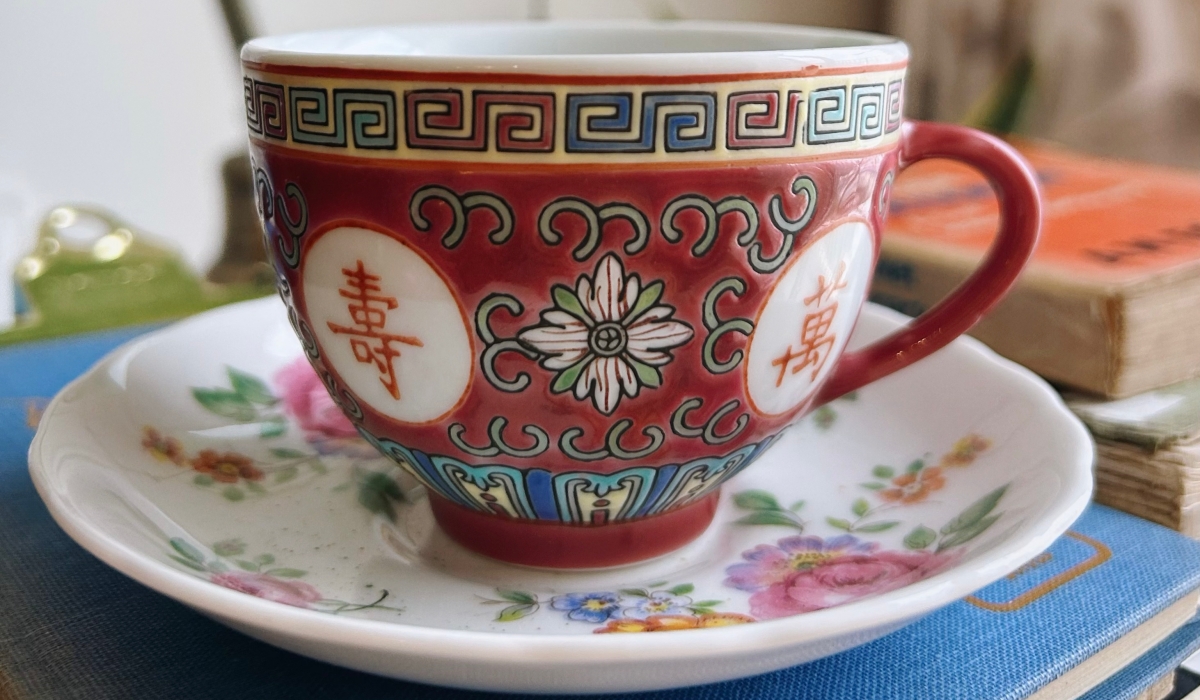 因为淘来的都是老瓷,所以成对成套很有难度,有时杯耳都已经断掉。某天心血来潮,将万寿无疆咖啡杯和英瓷杯碟混搭在一起,真的是完全的极繁主义了,俗气又丰盛。好像突然明白了烈火烹油、鲜花着锦之盛的南洋餐桌,食器要明艳,食客要尽兴。明知盛筵必散,照样载歌载舞。想起《红楼梦》里的一段:“那红尘中有却有些乐事,但不能永远依恃,况又有‘美中不足,好事多魔’八个字紧相连属。”