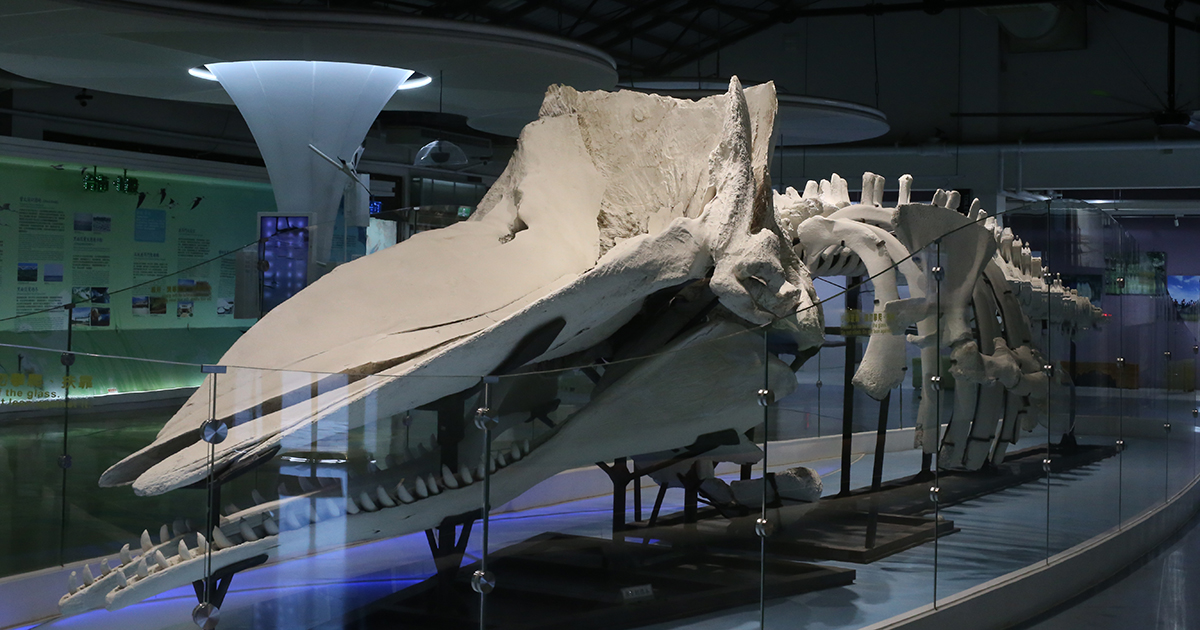 北门游客中心由昔日的洗涤盐工厂仓库改建而成,馆内最醒目的地标,是一座巨大的抹香鲸骨骼标本。(摄影:傅译萱)
