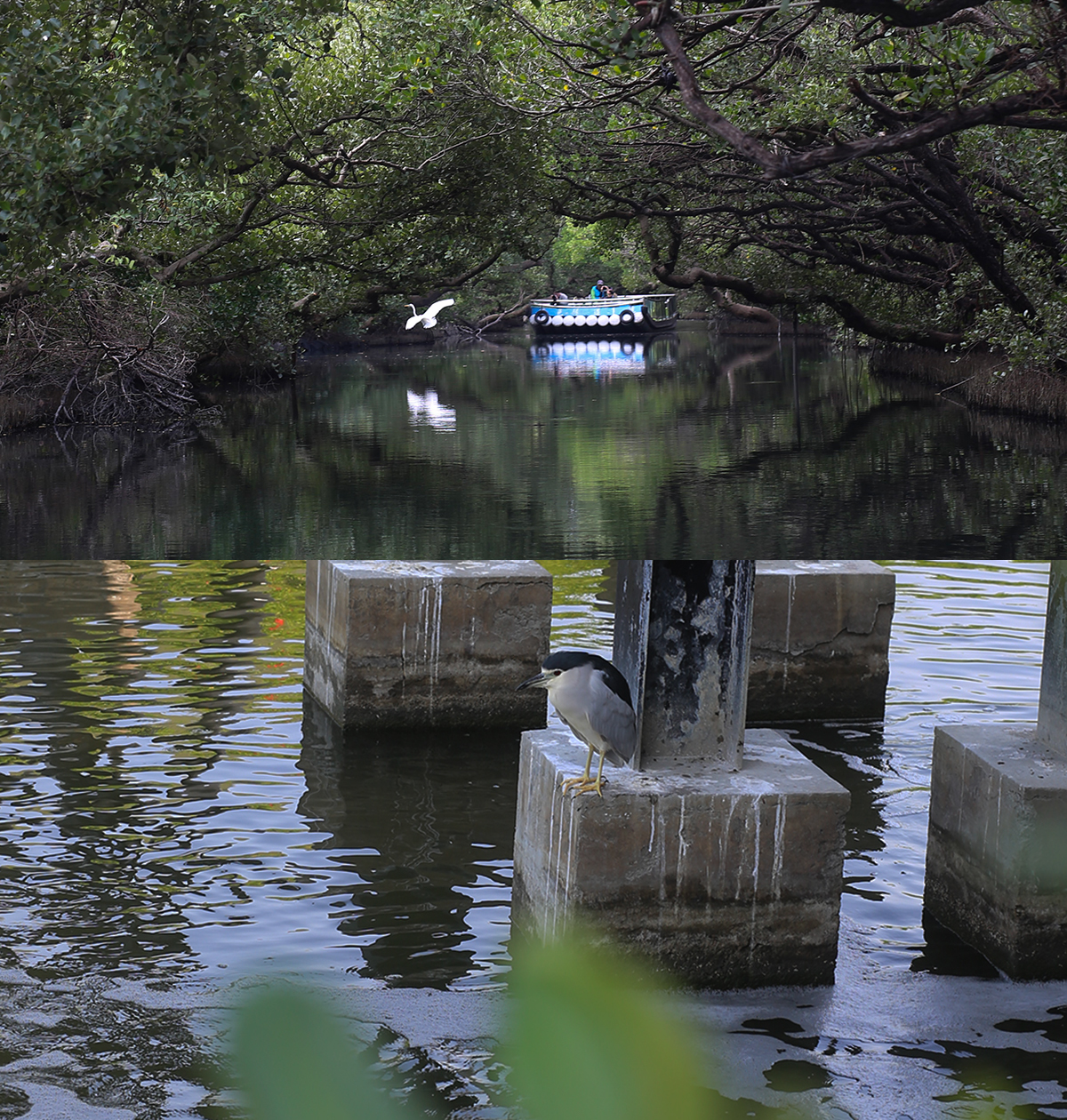 坐上摆放几十张小凳子的竹筏,我们慢慢地往幽林深处前进。河流两侧是茂密的红树林,枝叶交错成天然穹顶;越往里去,就越要低头闪避茂盛的树干。斑驳的光透过树木映照水面波纹,一切都显得格外安静,耳边只有讲解员的解说和快门声回荡。