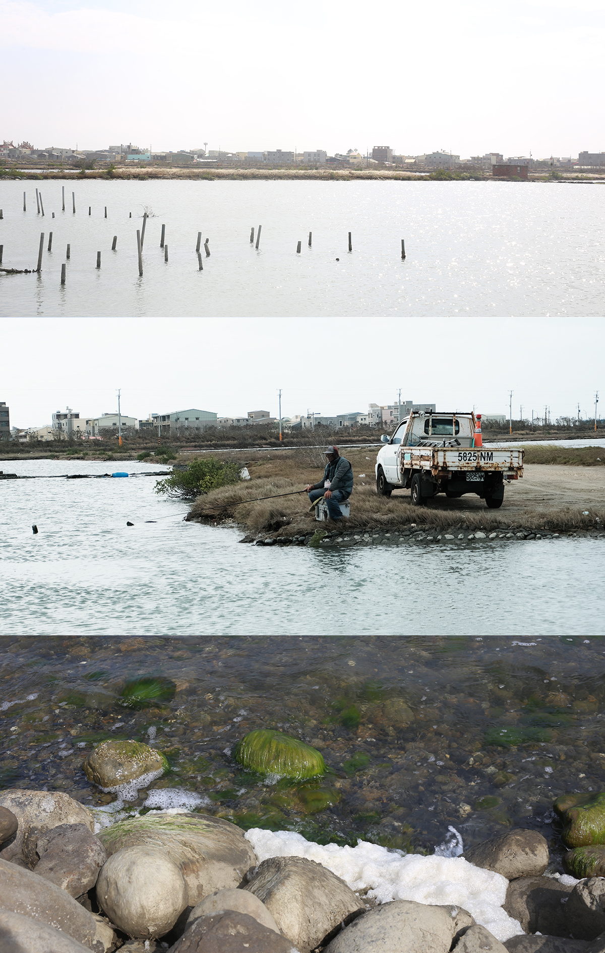 我们驱车进入闲置的盐田,它已回归自然怀抱,劳动场景不复存在。如今视野开阔而静谧,青苔猖狂地占据田地、爬上田边的石头,美得荒凉。钓鱼的人们稀疏地散落在田边,找好位置就开始垂钓。