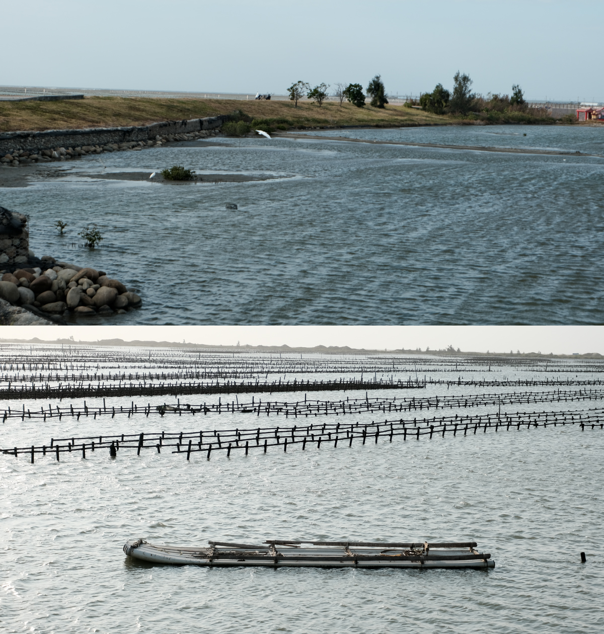 经过盐田,再往里边走十分钟,我们抵达北门泻湖体验水岸风光。水上有满布的蚵棚,可以看见蚵农的小舟经过,也可看见不少候鸟驻守于此。