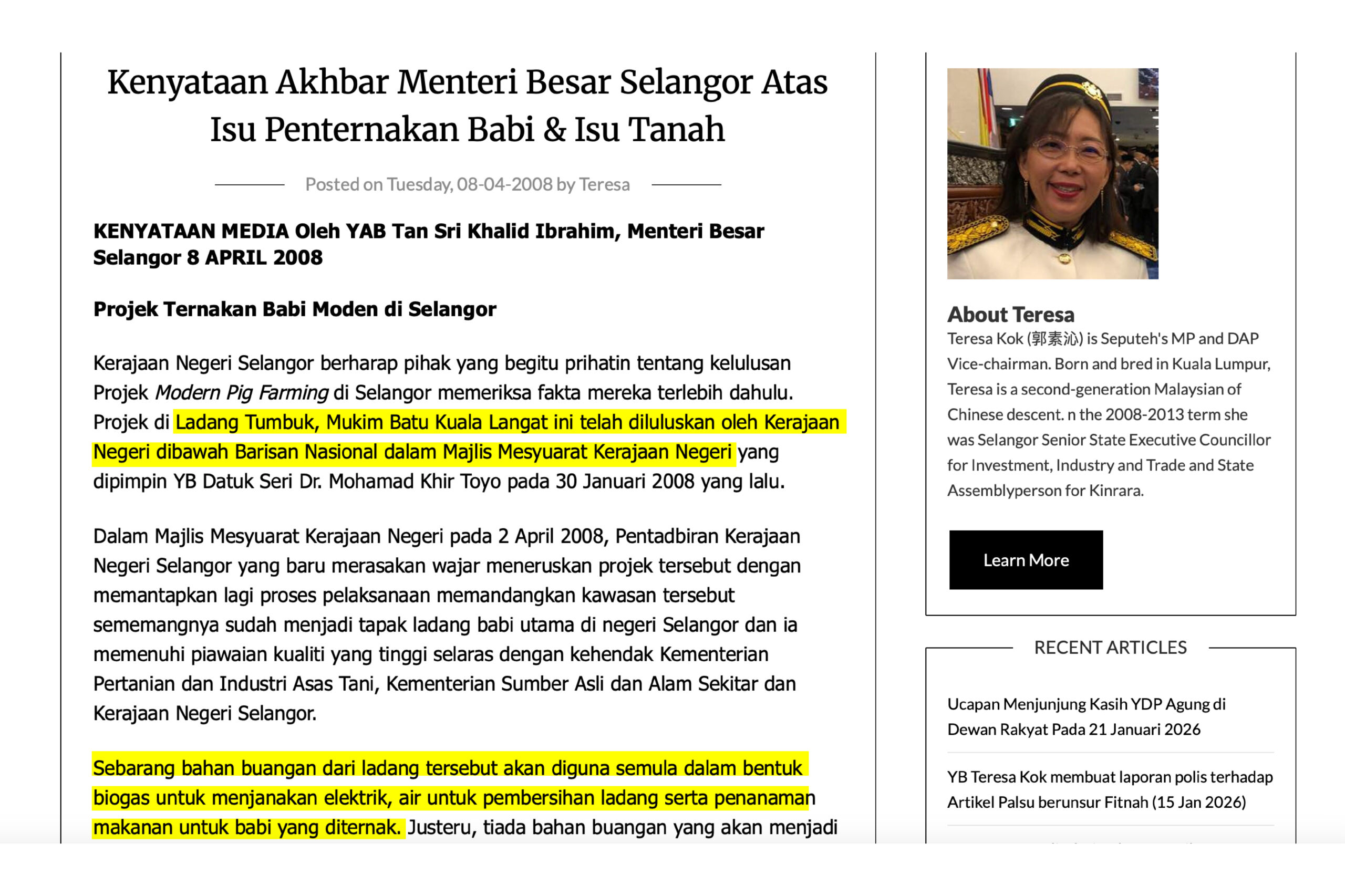 根据该声明,位于丹绒士拔东目(Ladang Tumbuk)的现代化养猪计划,早在2008年,即由当时仍由国阵执政、由拿督斯里莫哈末基尔·多尤领导的州行政议会批准。