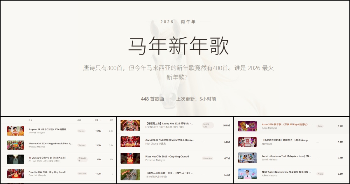 根据社交媒体流传,马来西亚2026年的新年歌已经突破四百首,而这个数字背后,离不开技术的便捷,和商业的利益。