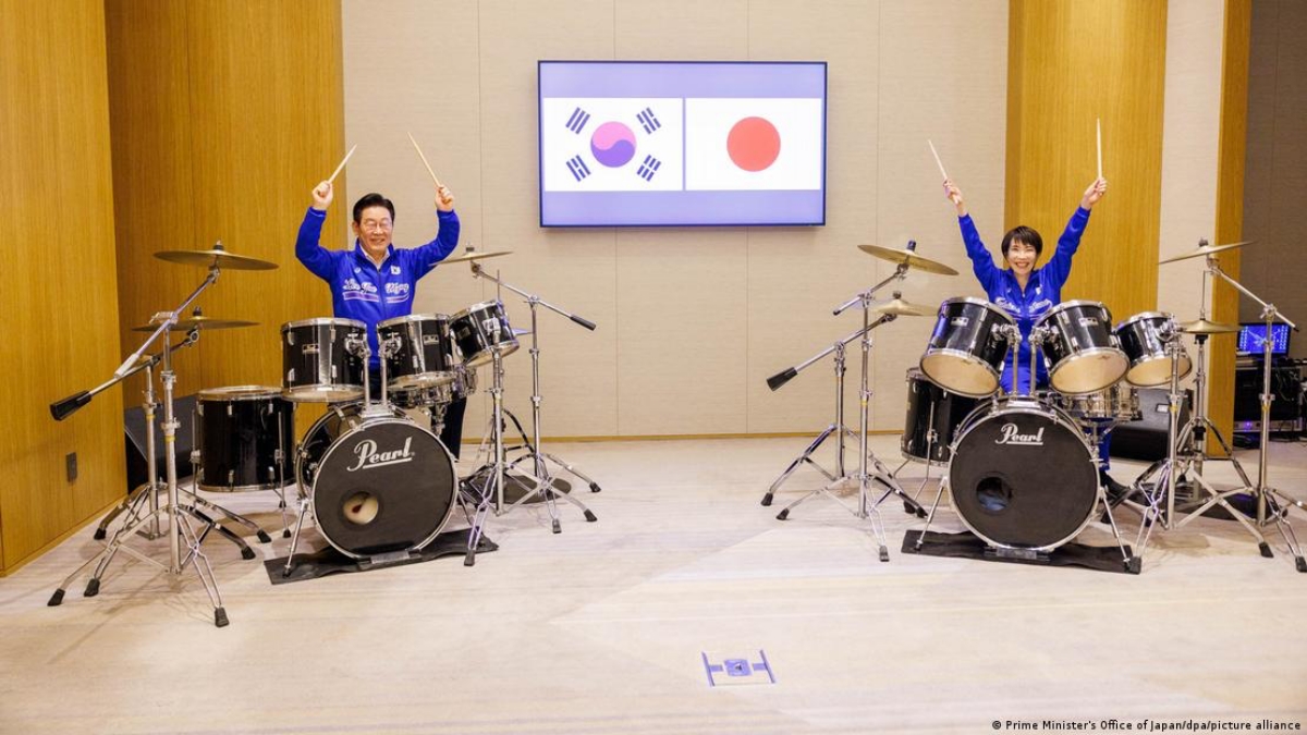 高市早苗在韩国总统李在明来访中安排了与他一起打架子鼓的互动环节。(图片来源:德国之声)