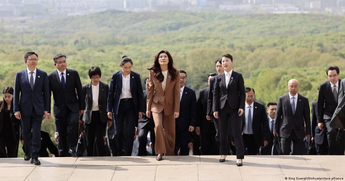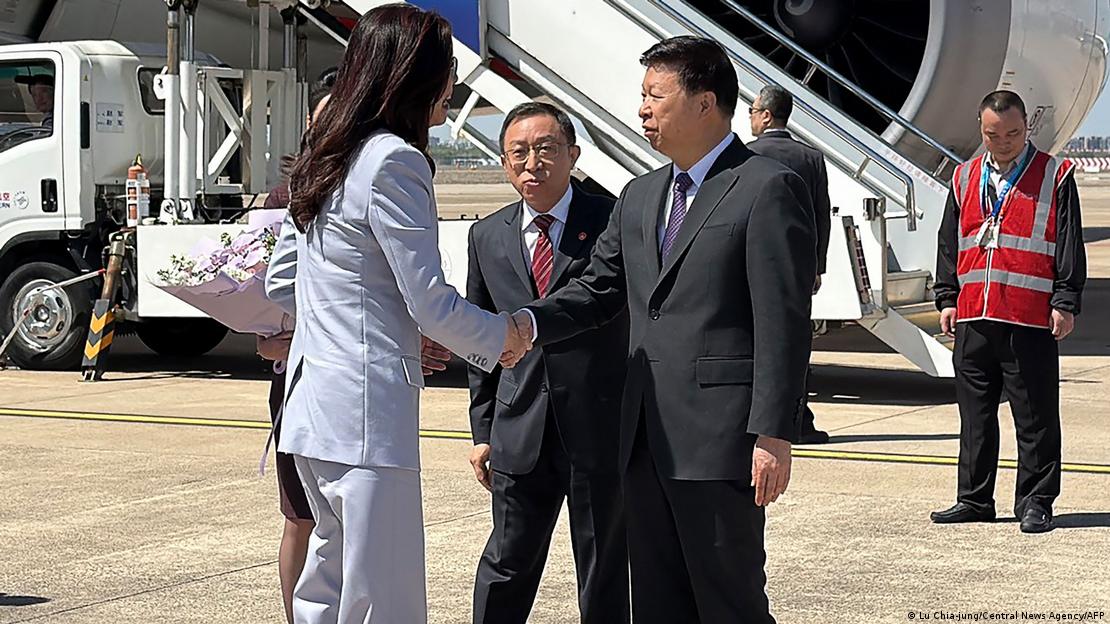 郑丽文4月7日中午率中国国民党访问团抵达上海虹桥机场,中共中央台湾工作办公室主任宋涛到机场迎接。(德国之声)