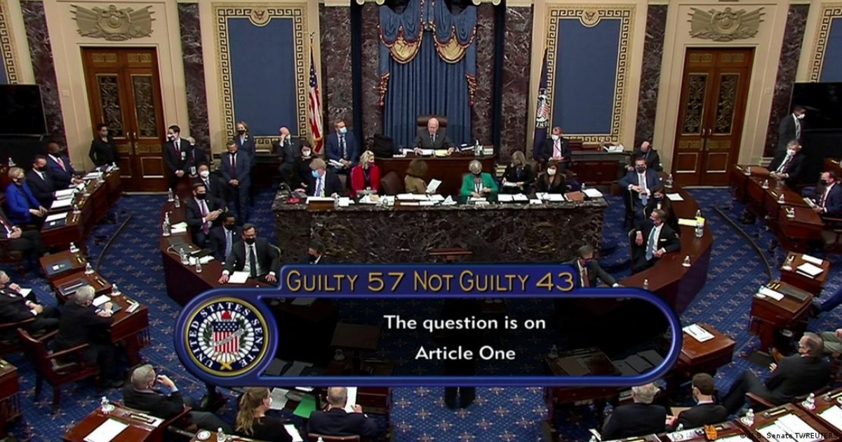 2021年,美国参议院曾经投票表决弹劾特朗普,但参议院的投票结果未能达到定罪所需要的票数,因此特朗普最终被宣告无罪。在100名参议员中有57人投票支持特朗普有罪,其中还包括7名来自共和党的议员。但是根据美国宪法规定,必须要达到三分之二以上的多数票数,才能够判定有罪。因此,弹劾案最终落幕。(图片来源:德国之声)