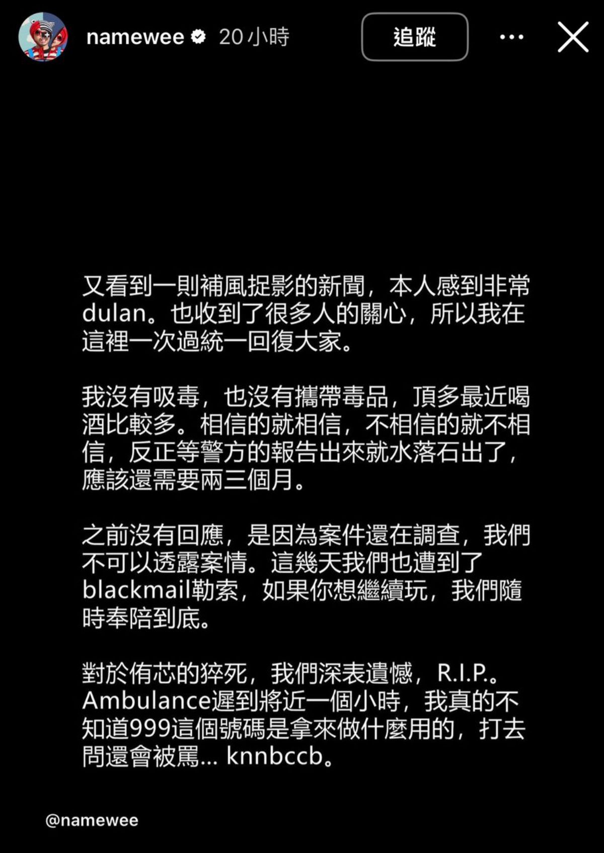 一场原以为是突发健康意外的悲剧,如今牵扯出娱乐圈与毒品、名人私生活的多层面谜团。警方证实黄明志在场、现场发现疑似毒品、尿检呈阳性,这些事实已令事件不再单纯。而谢侑芯的真正死因、两人关系的细节,以及所谓“勒索”说法的真伪,仍待时间与调查揭开。
