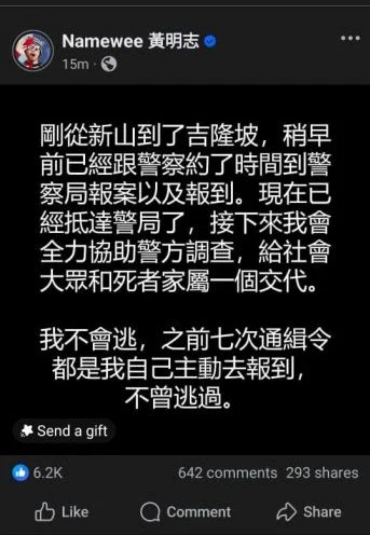 11月5日(星期三)凌晨1时许,黄明志在脸书发文:“我已经从新山出发,现在到达吉隆坡,按照约定前往警局配合调查,请大家不要猜测,我会诚实面对。”