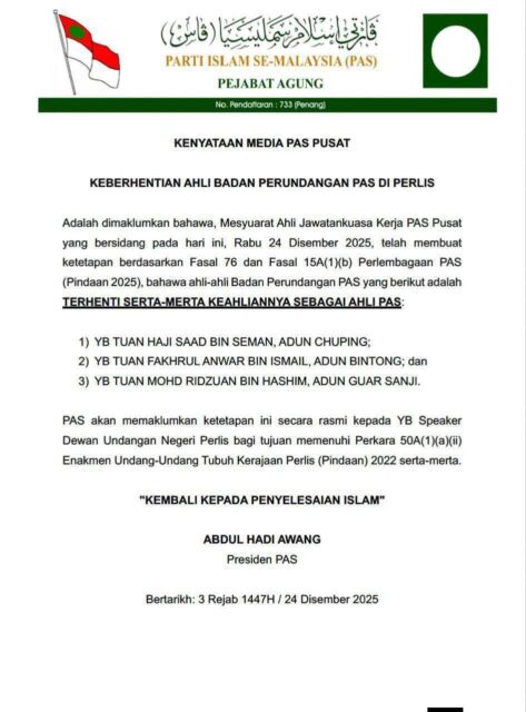 随着事态升温,伊党迅速采取强硬行动。伊党主席丹斯里哈迪阿旺宣布,根据党章条文,即时开除3名玻璃市州议员党籍,指他们的行为已构成严重违纪与背叛党组织。