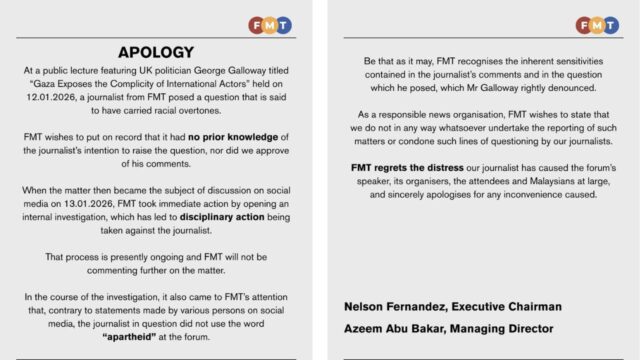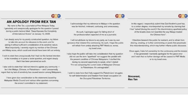 随后,陈传旭本人也撰文公开道歉,坦承其提问措辞不当、牵强且不必要,并对在问题中提及马来人及华人深表懊悔。“我绝无任何煽动或种族主义意图,”他说,并强调无意激怒任何群体,包括马来人、华人或巴勒斯坦人。