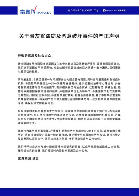 声明指出,盗窃骨灰瓮不仅是刑事犯罪,更严重侵犯逝者尊严及家属情感,因此集团已启动最高级别危机应对机制,并为受影响家属提供法律与心理支援。