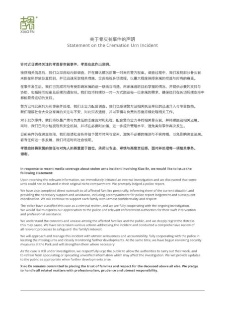 集团在声明中指出,所有被盗骨灰瓮目前已全部寻回,并正在进行核对与妥善安置。