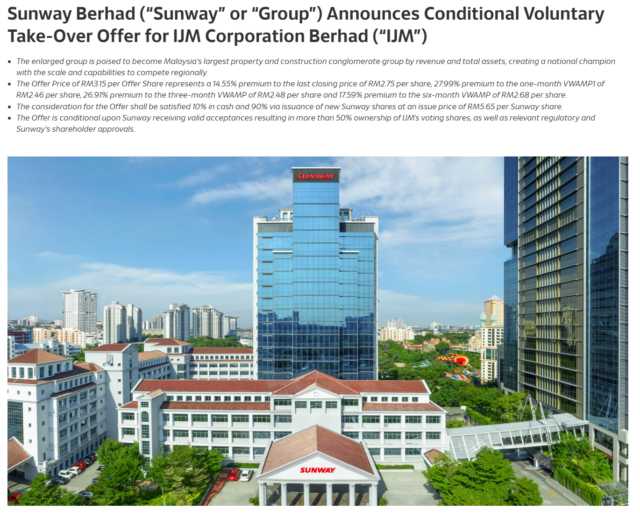 今年1月,双威集团宣布(Sunway Group)提出一项总值约110亿令吉的收购计划,拟全面收购在马股上市的建筑与基建集团怡保工程(IJM)。根据方案,双威将先收购“50%+1股”,若达到条件则进一步全面收购,打造马股规模最大的综合企业之一。