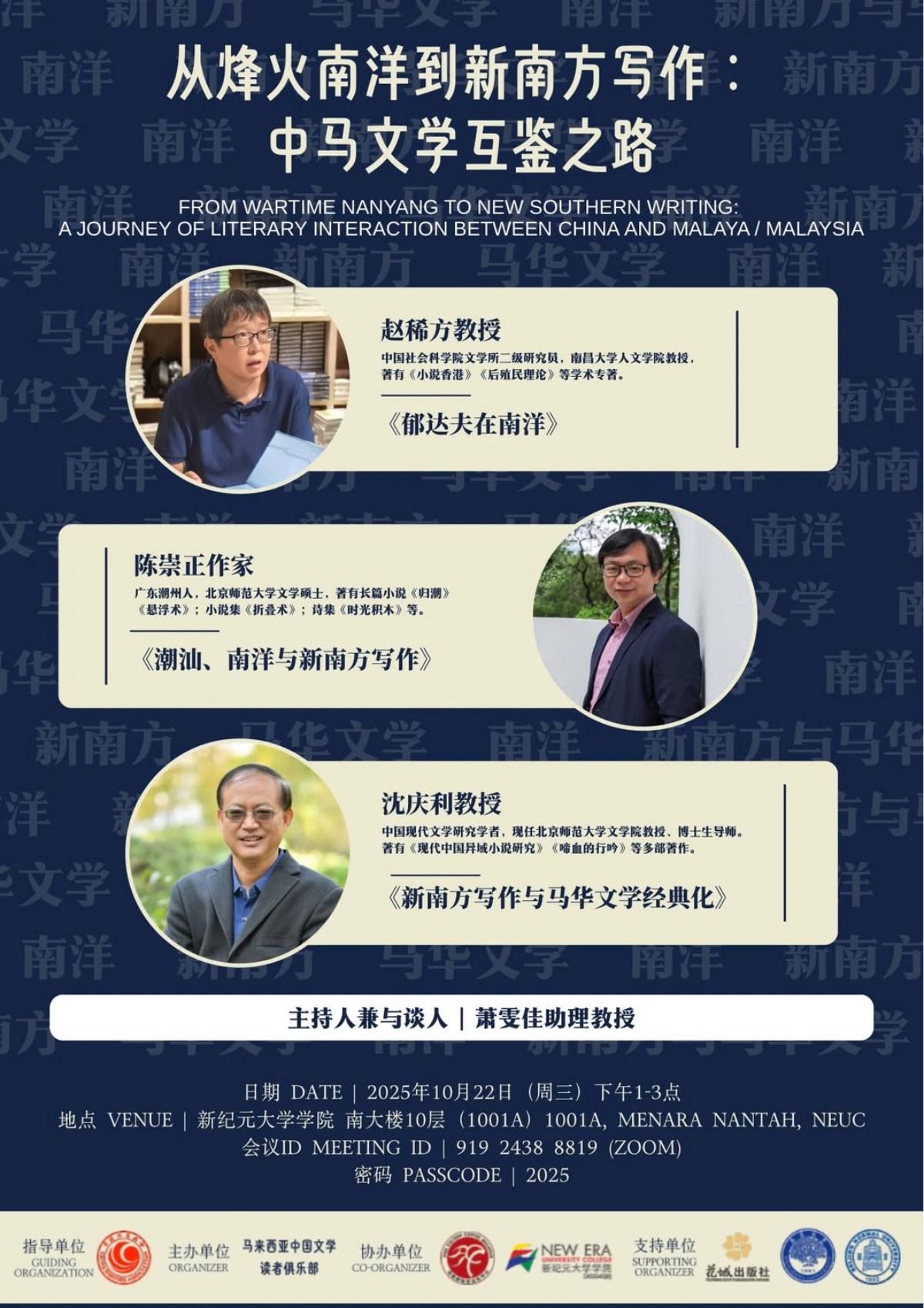 由中国作家协会指导、马来西亚中国文学读者俱乐部主办,马来西亚汉文化中心、新纪元大学学院,协办的“新南方与新南洋”文学系列活动,将于2025年10月22日(星期三)下午1时至3时,在新纪元大学学院南大楼10层1001A课室举行。