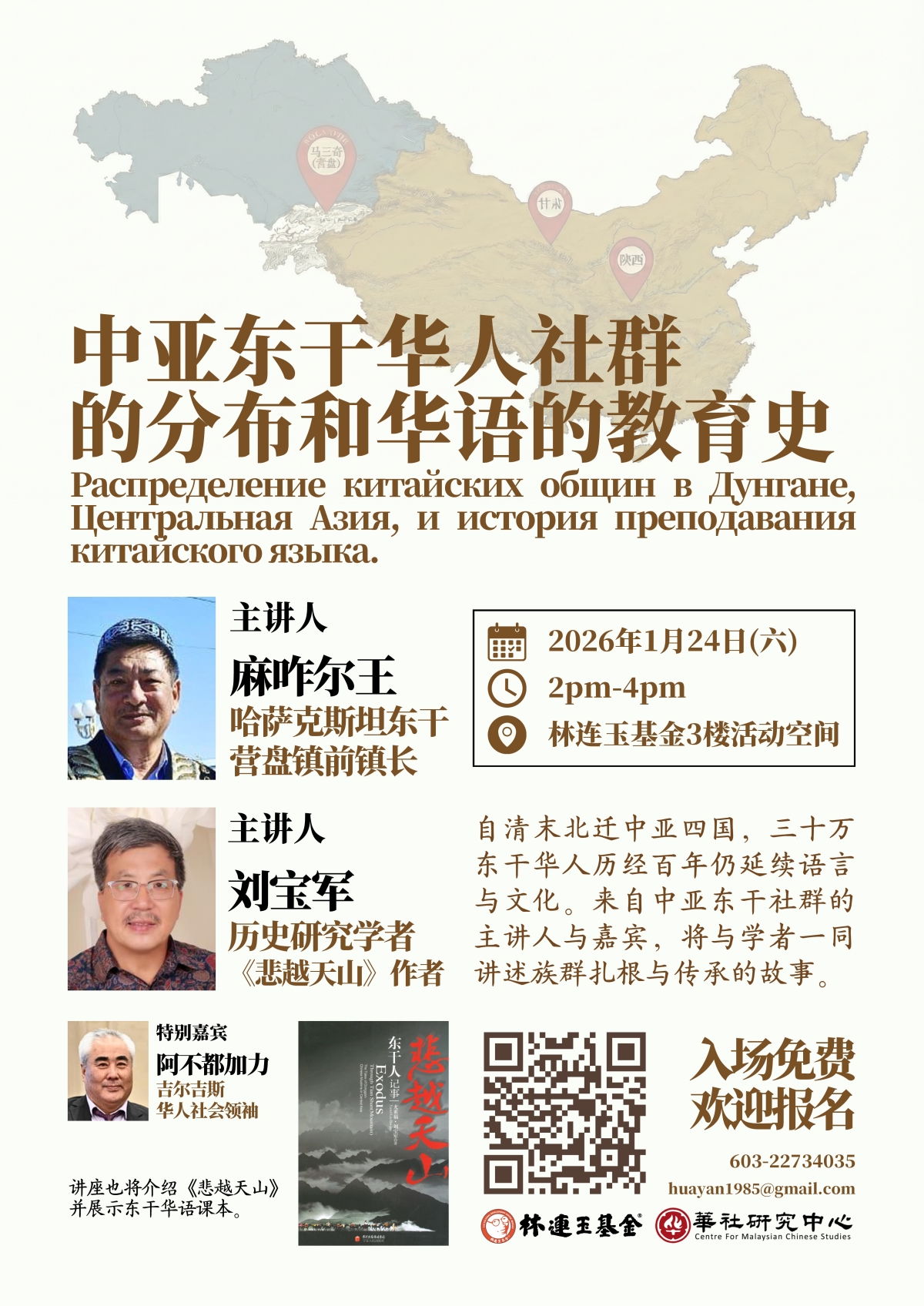 马来西亚华社研究中心(华研)与林连玉基金将于1月24日举办讲座,活动荣幸邀请到哈萨克斯坦东干营盘镇前镇长麻咋尔王和历史研究学者刘宝军主讲。