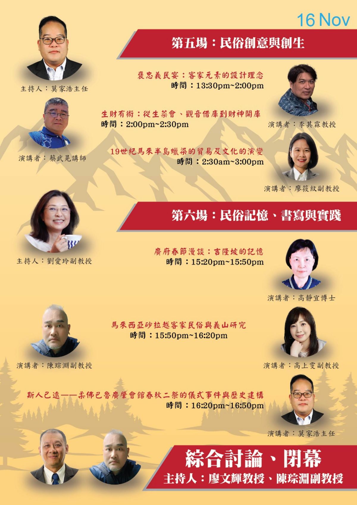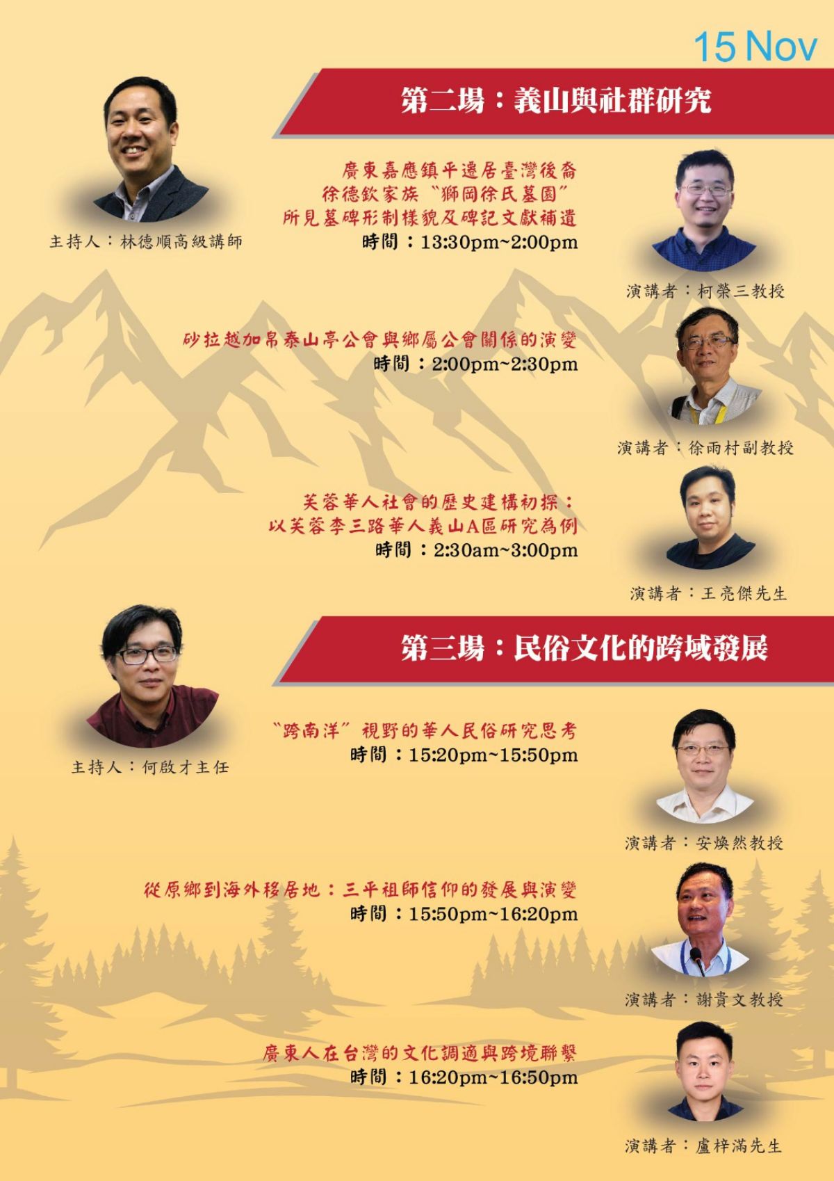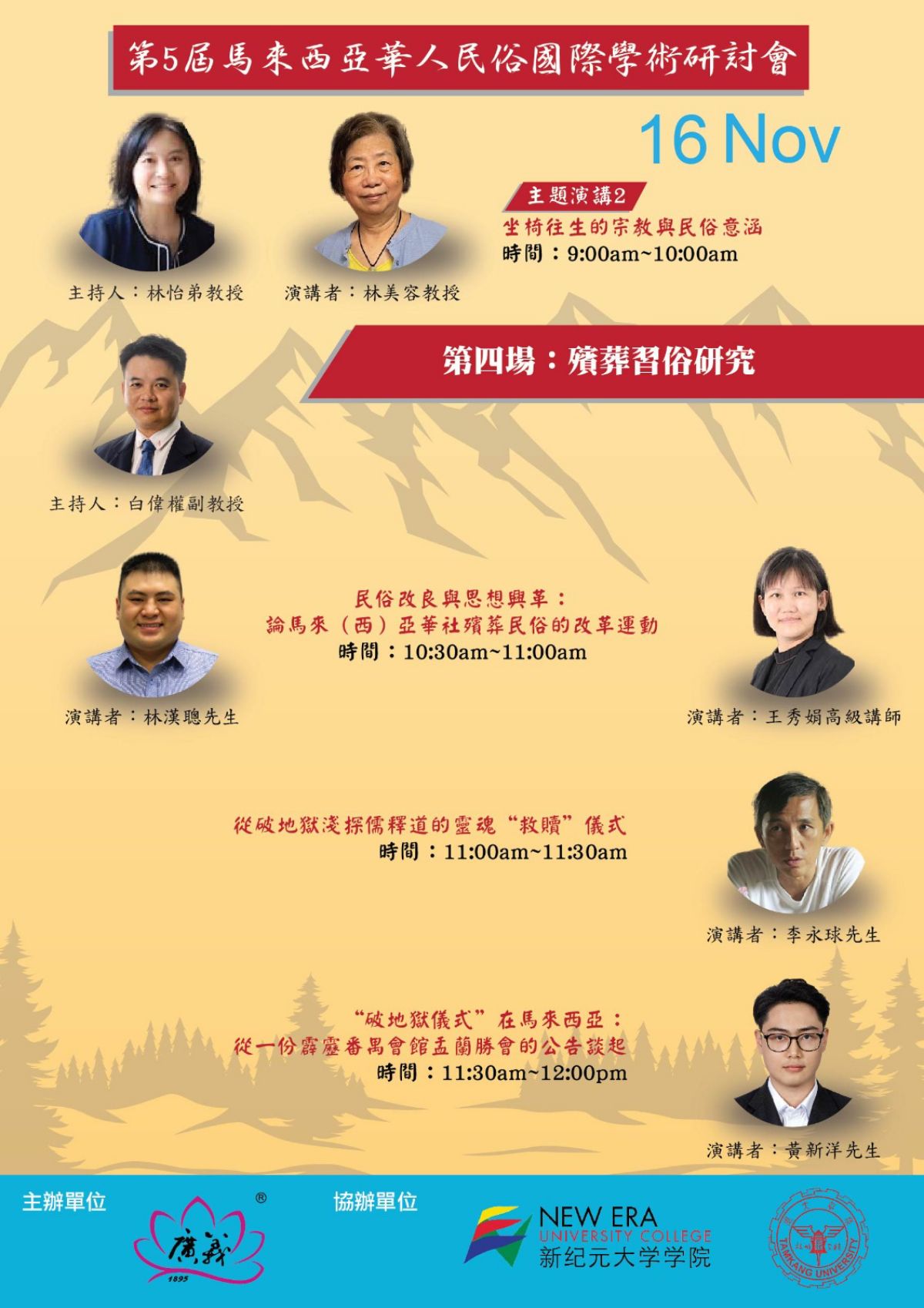 为期两天的研讨会主题广泛,涵盖“义山与社群研究”、“殡葬习俗研究”、“民俗文化的跨域发展”以及“民俗创意与创生”等领域。来自马来西亚和台湾及东南亚地区的多位著名学者将发表专题论文与主题演讲,包括江柏炜教授《东南亚华人义山研究的回顾与前瞻》、阮涌俰研究员《吉隆坡广东义山创立前史(1881–1895)》、郭宗华助理教授《吉隆坡广东义山于迁山事件后社会功能的变革》、林美容教授《坐椅往生的宗教与民俗意涵》及李永球先生《从破地狱浅探儒释道的灵魂救赎仪式》等,议题兼具学术深度与文化价值。