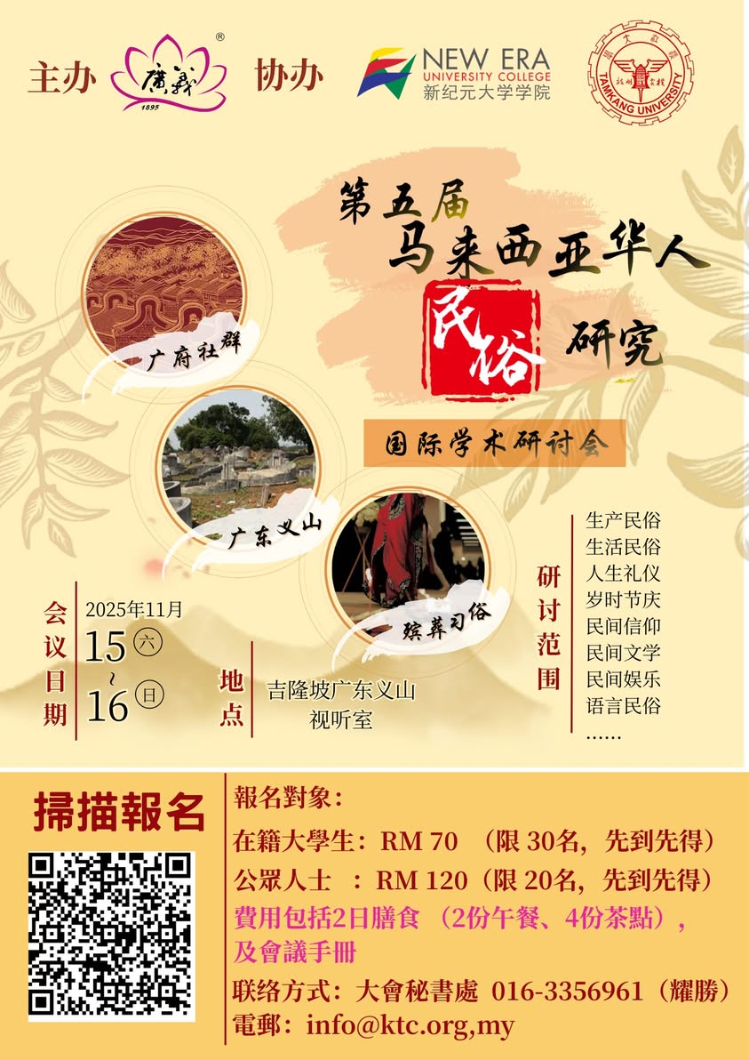 一期一会学术盛事!第5届马来西亚华人民俗研究国际学术研讨会,将于2025年11月15日及16日,在吉隆坡广义大厦视听室盛大举行。