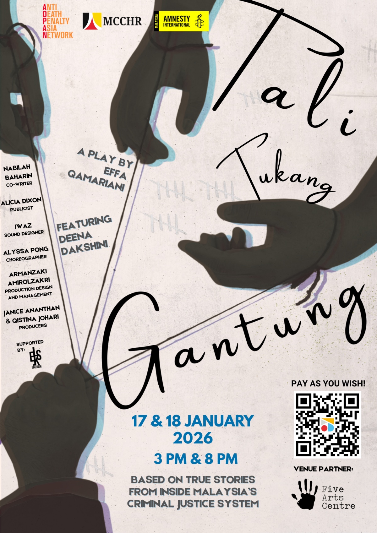 马来西亚宪政与人权中心(Malaysian Centre for Constitutionalism and Human Rights)、反死刑亚洲网络(Anti-Death Penalty Asia Network)及国际特赦组织马来西亚分会(Amnesty International Malaysia)将于本月联合呈献一部聚焦死刑议题的剧场作品《绞刑之绳》(Tali Tukang Gantung)。