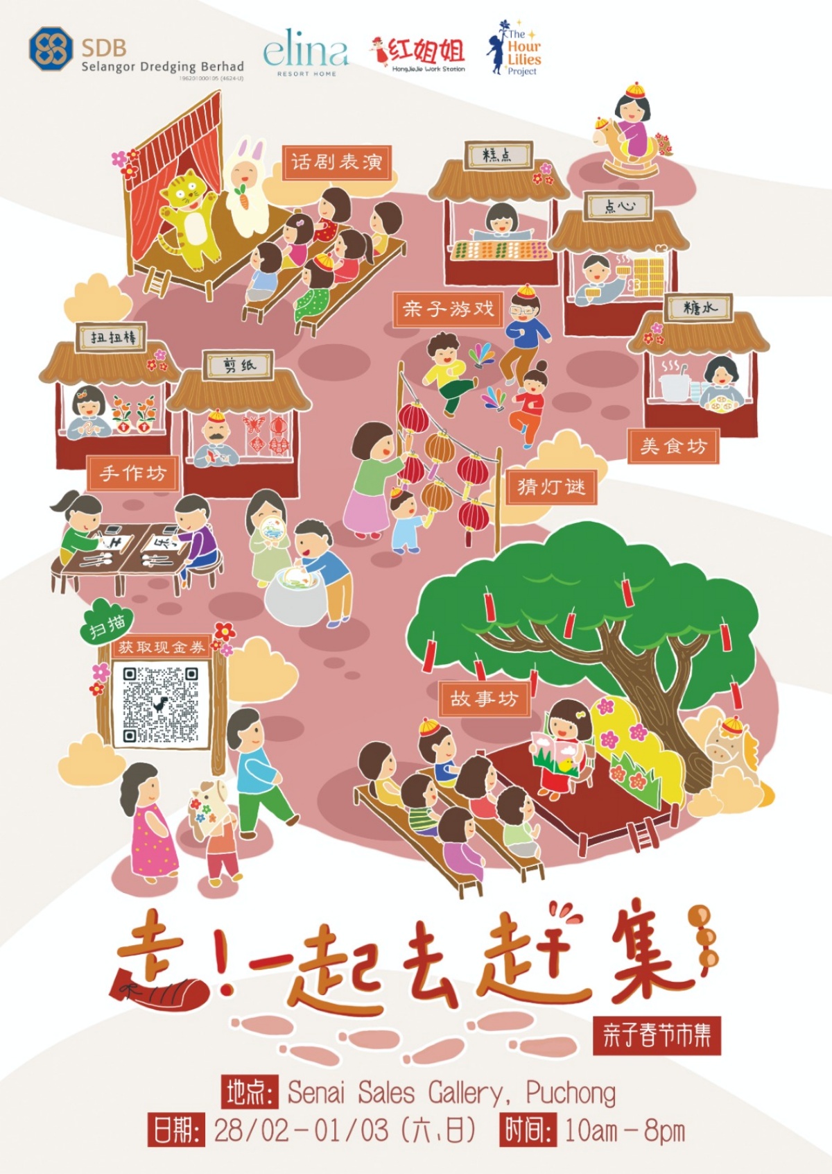 “走!一起去赶集”亲子春节市集,由Selangor Dredging Berhad主办、红姐姐工作室与童社会联合策划,将于2026年2月28日至3月1日在 Senai Sales Gallery Puchong举行。活动开放时间为上午10时至晚上8时,免费入场。