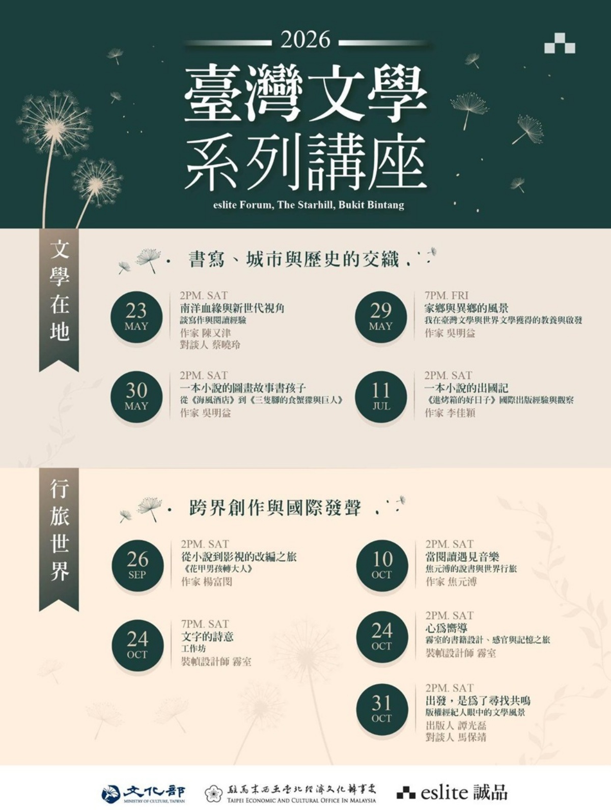 由诚品马来西亚与驻马来西亚台北经济文化办事处联合主办的第三届“台湾文学系列讲座”,将于2026年5月至10月在诚品生活吉隆坡举行。
