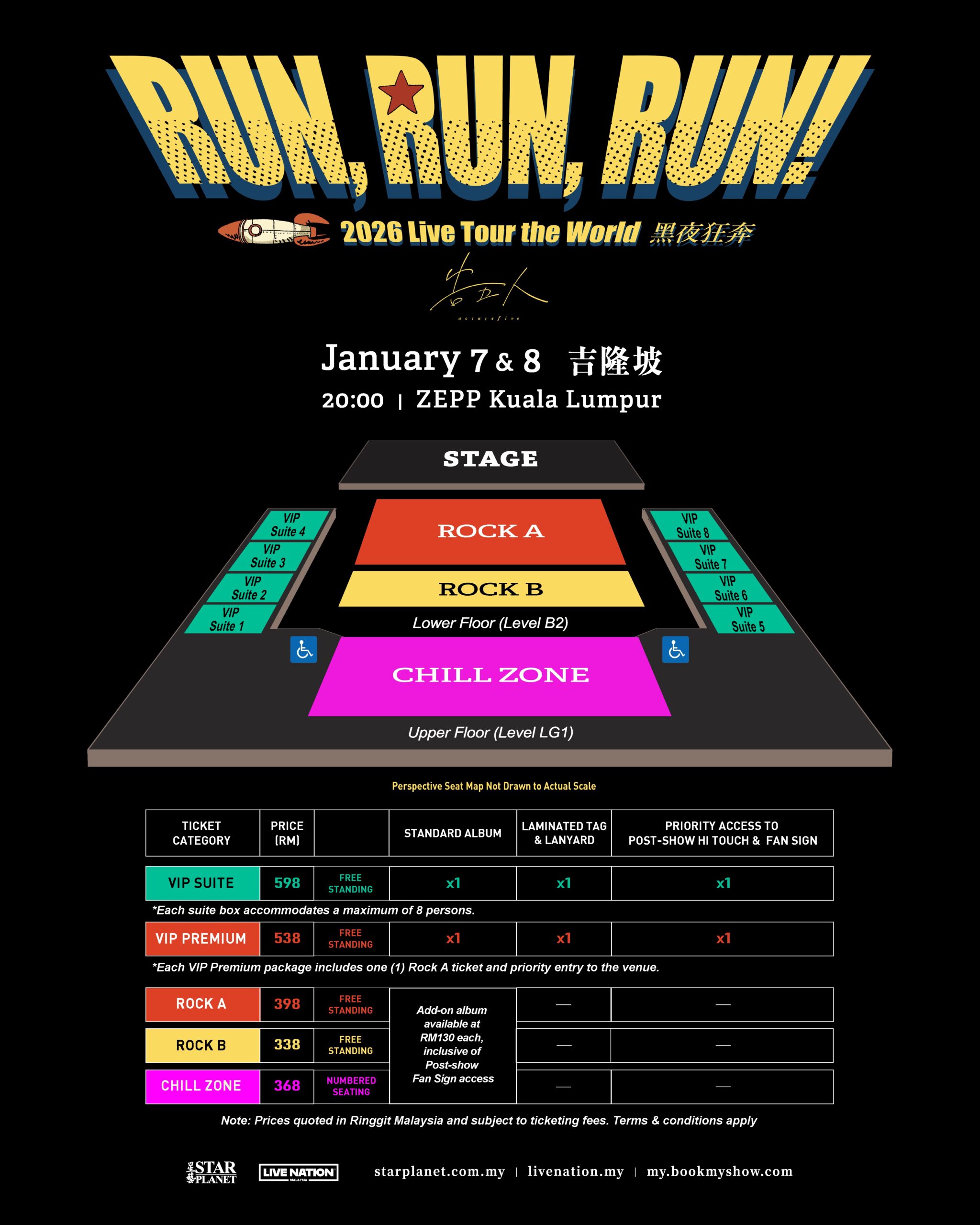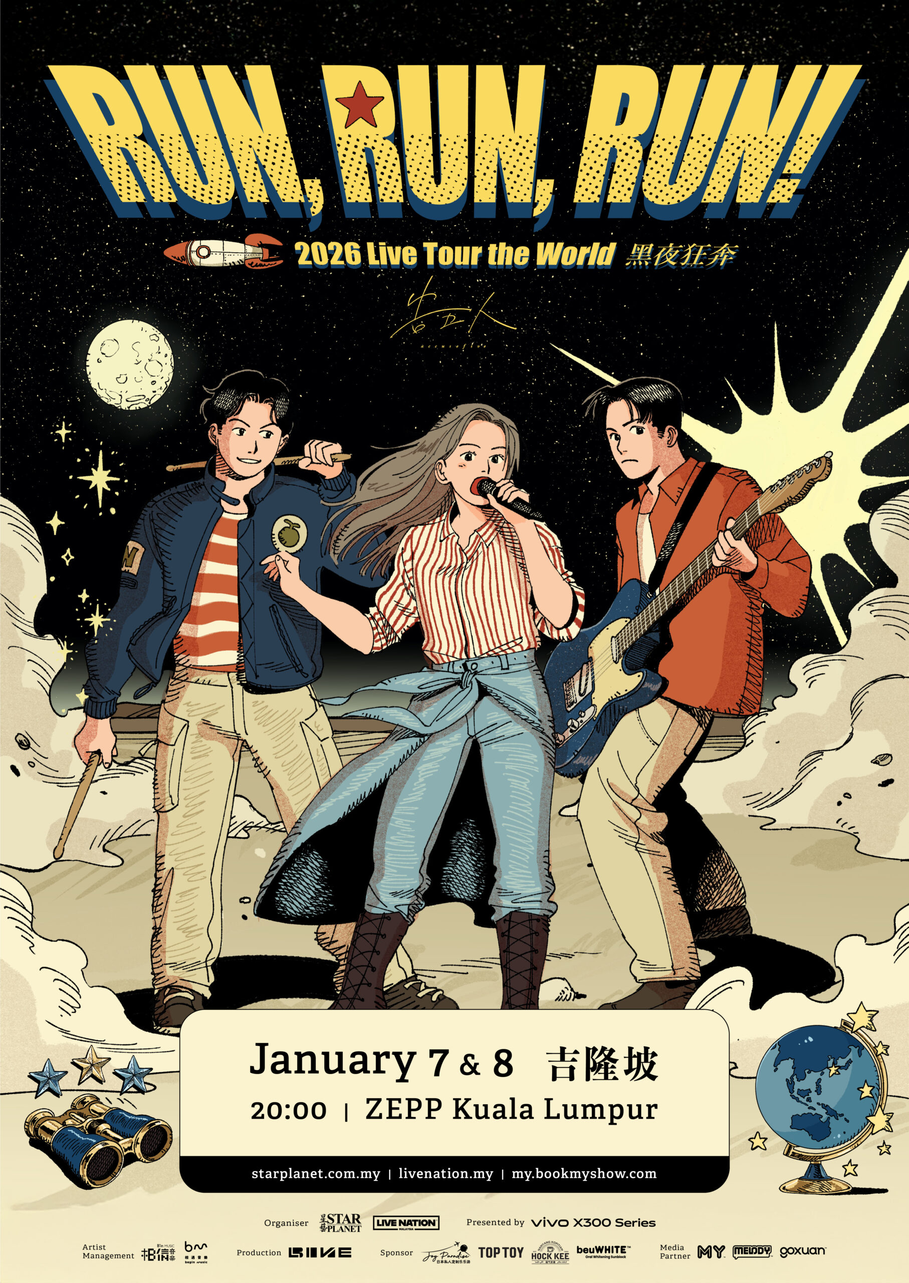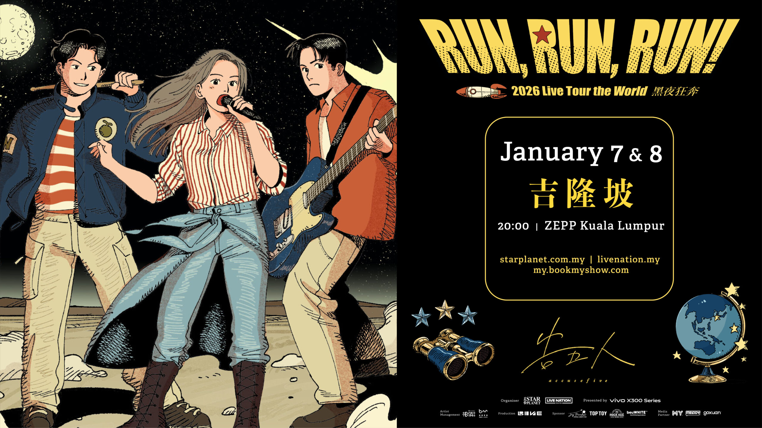 告五人《Run, Run, Run! 黑夜狂奔》吉隆坡站门票将于2025年11月6日(四)下午1点起,透过my.bookmyshow.com正式全面开售。Mastercard 持卡人更可享有专属优先购票礼遇,抢先锁定心仪席位!优先购票时间为11月5日(三)上午11时至晚上11时59分,