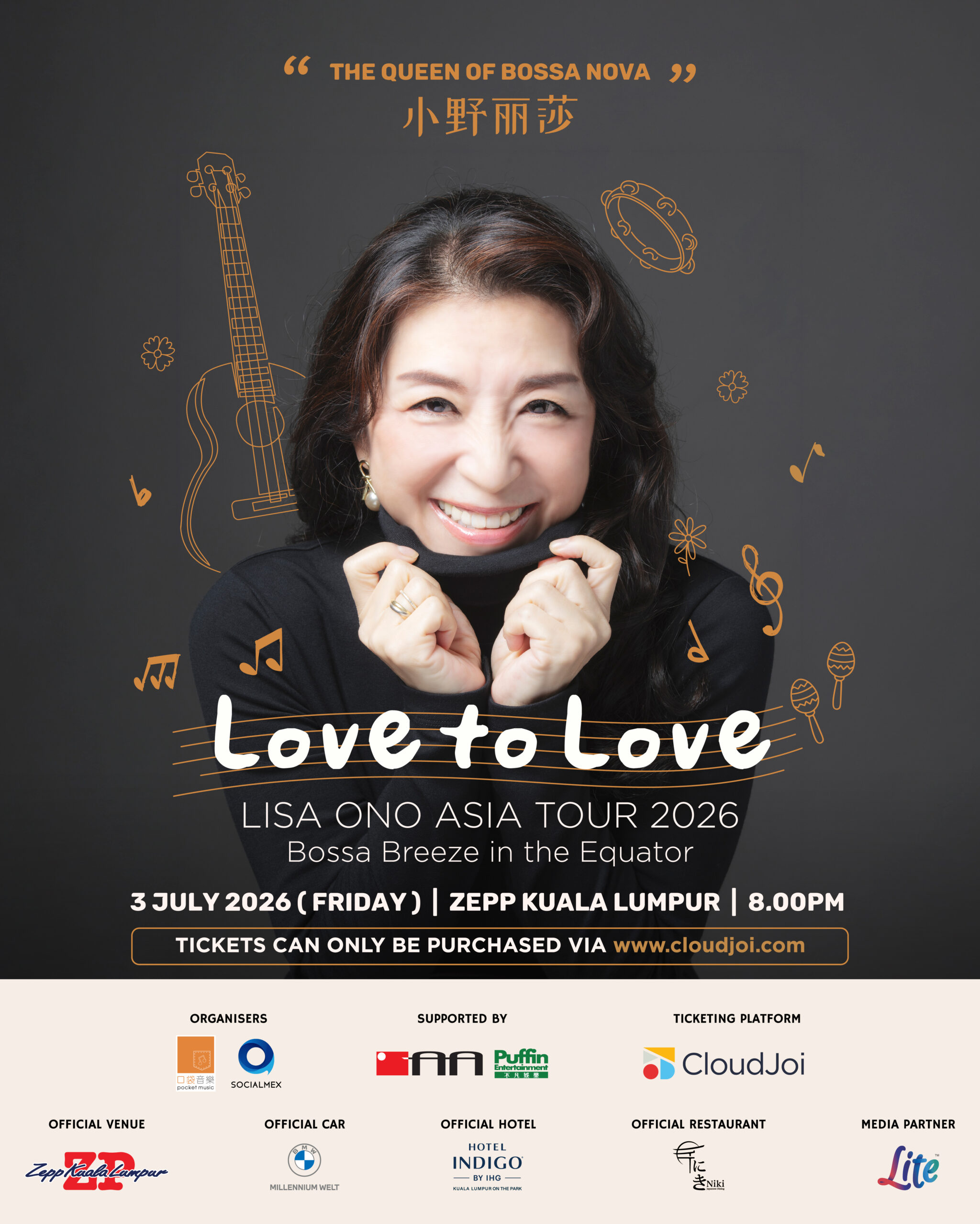 由口袋音乐及SOCIALMEX主办,国际知名芭莎诺瓦(Bossa Nova)歌手小野丽莎(Lisa Ono) 将于2026年7月3日晚上8时,在吉隆坡Zepp Kuala Lumpur举办特别演唱会 《LOVE TO LOVE:芭莎诺瓦之夜》。她将携同日本芭莎诺瓦乐团同台演出,为观众带来一场充满温度、律动与优雅气息的音乐之夜。