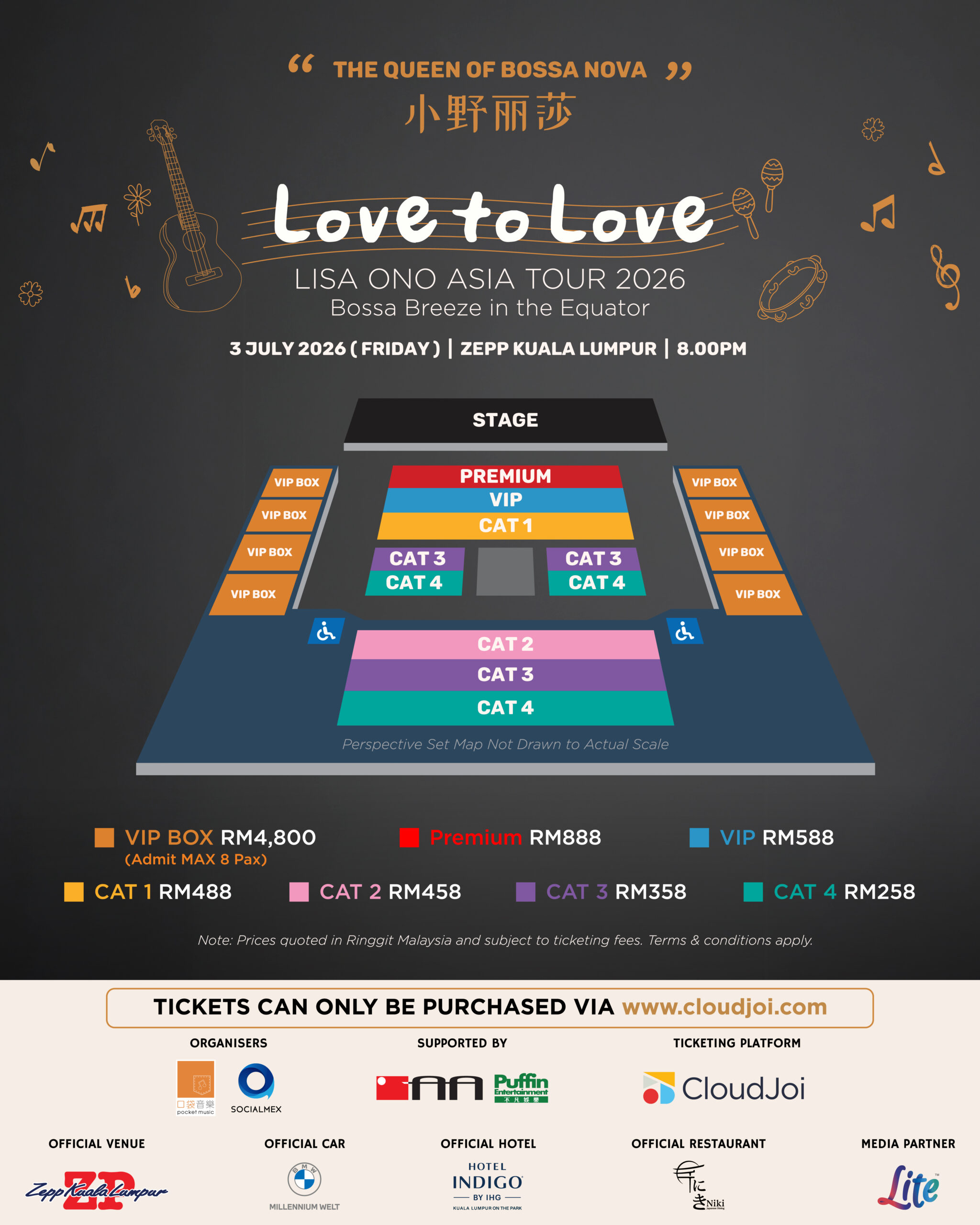 小野丽莎(Lisa Ono)《LOVE TO LOVE:芭莎诺瓦之夜》演唱会门票分别为RM 4800-VIP BOX (ADMIT MAX 8 PAX) ,Premium RM888- (with Premium Benefit)、VIP-RM588、CAT 1-RM488、CAT 2-RM458、CAT 3-RM358及CAT 4-RM258。门票将于4月10日(星期五)上午11时通过Cloudjoi官方网站正式公开发售。主办方呼吁广大歌迷尽早上线购票,把握难得机会,亲临现场感受这场充满魅力的音乐之夜。