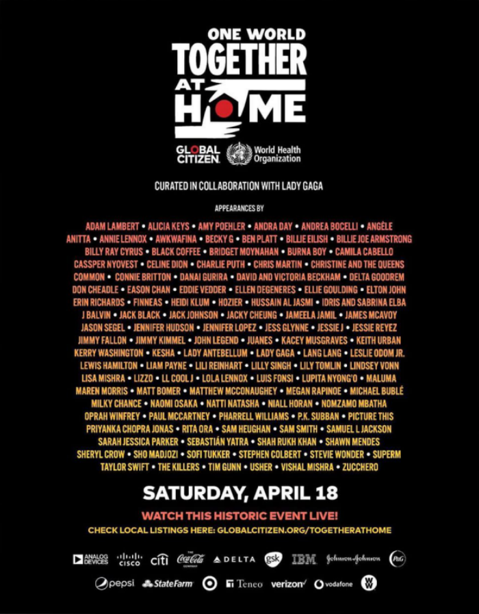 女神卡卡(Lady Gaga)也与全球公民和世界卫生组织(Global Citizen)合作,发起了《One World: Together at Home》直播演唱会,帮助筹募义款,以应对这次的疫情。