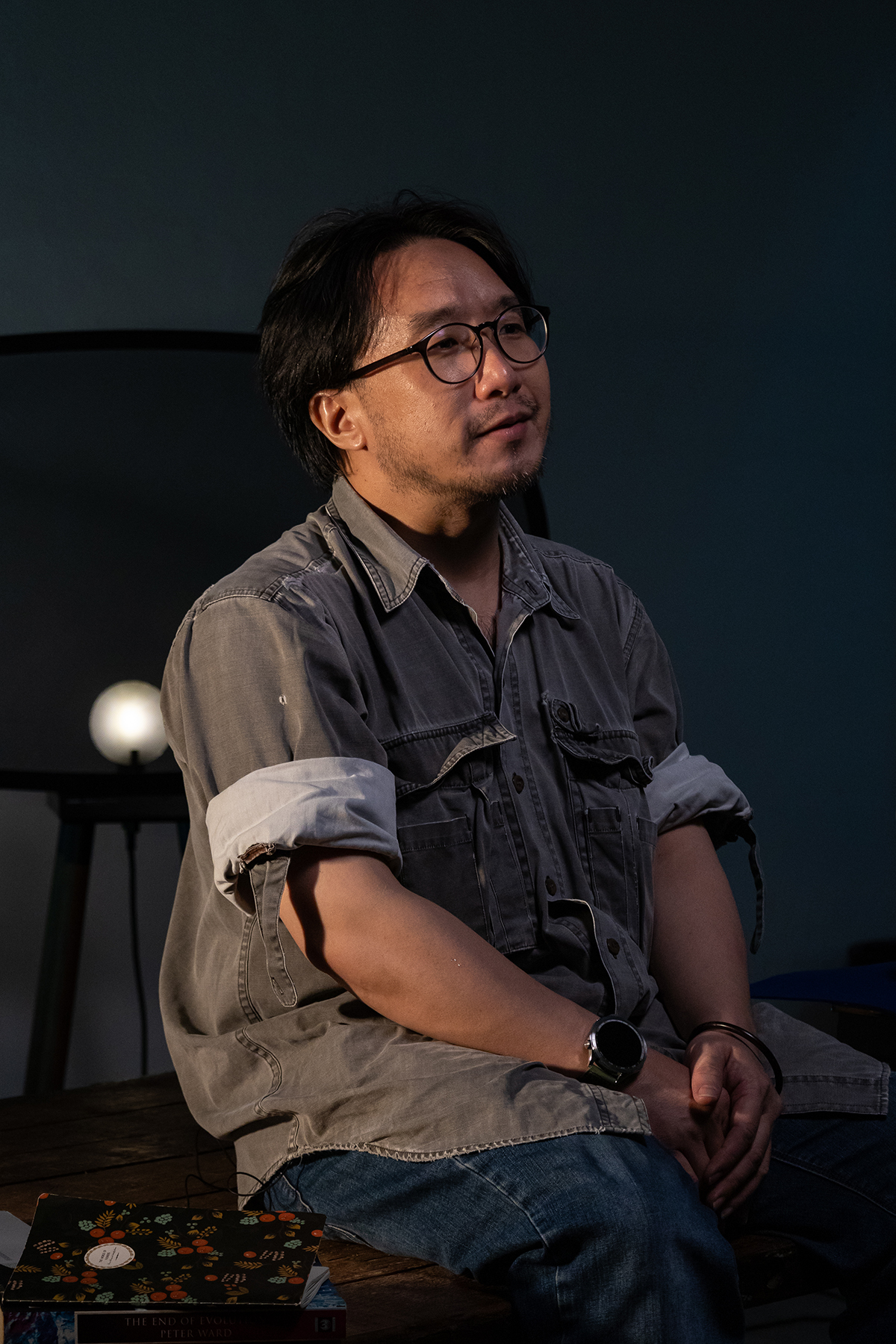采访当天,林泽昇穿了一件印有人猿图案的深色T恤。(摄影:傅译萱)