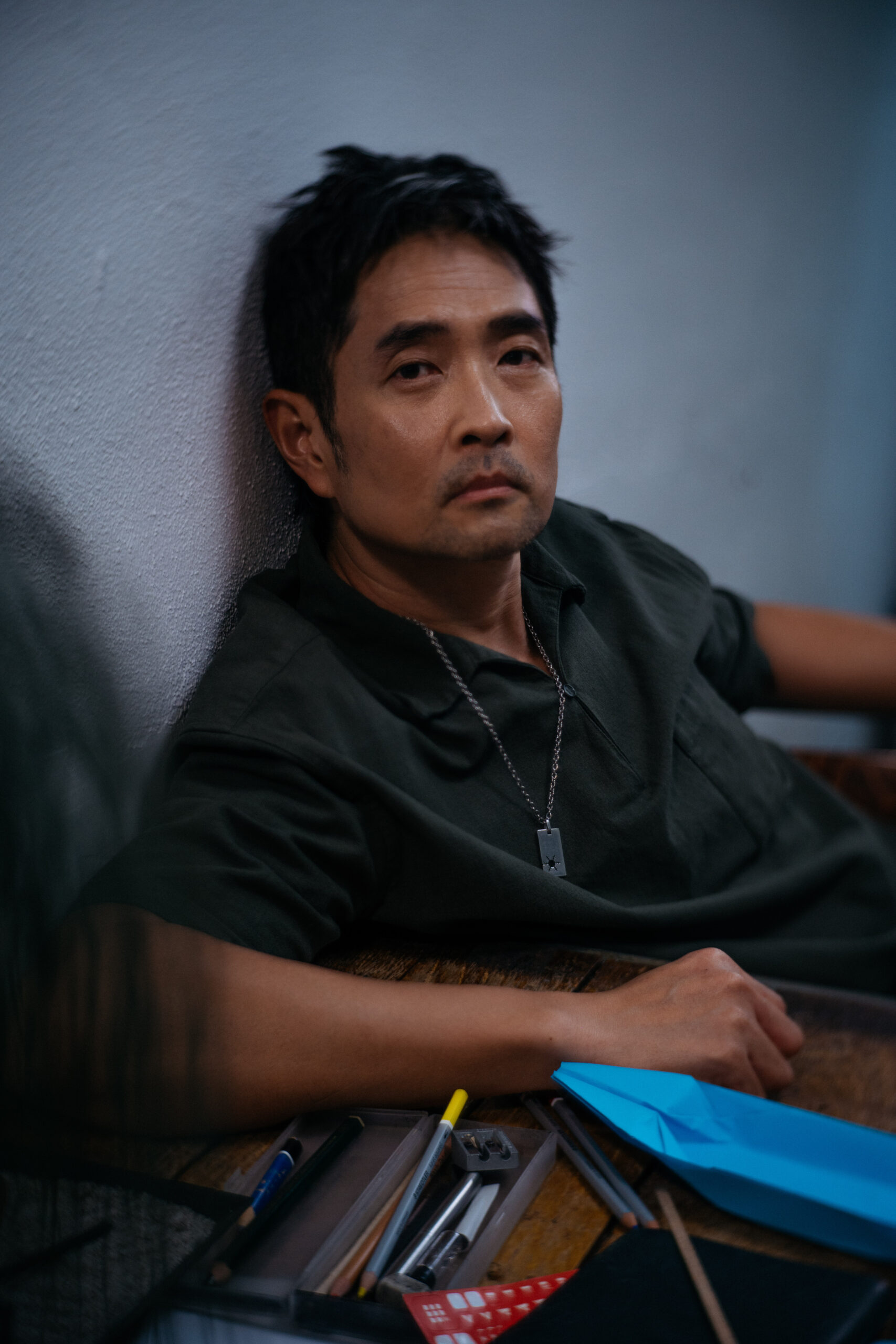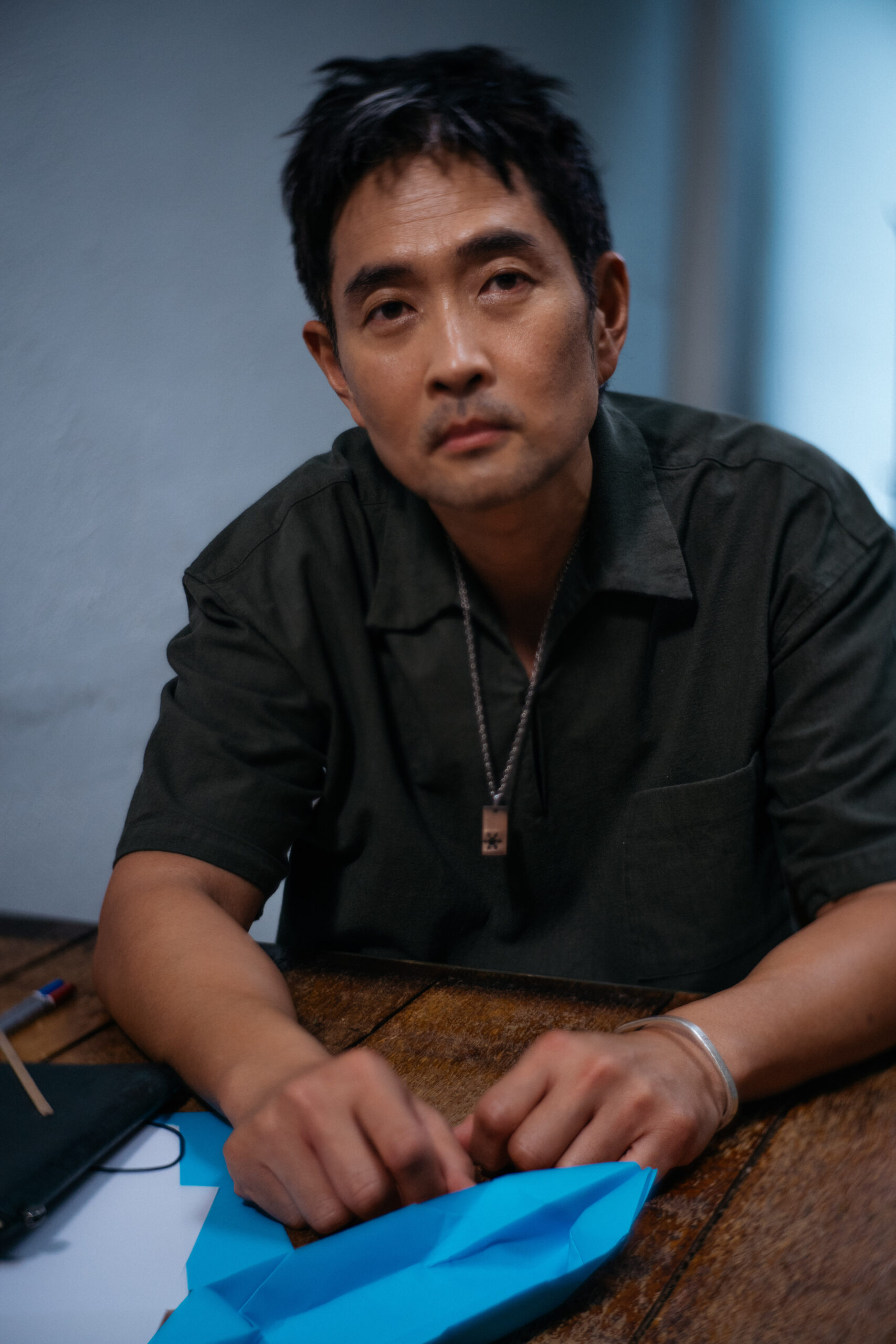 这场访谈约在八打灵再也的咖啡馆里,翁书强从蒲种的试戏现场赶来赴约,访问开始前他走到镜子前细细整理自己先前凌乱的头发。试镜的角色是一个不修边幅的人物性格,于是他在外形上做了调整。一身随性的穿搭,军绿色的衬衣里面是白色内搭,脸上带有历练感的胡渣。