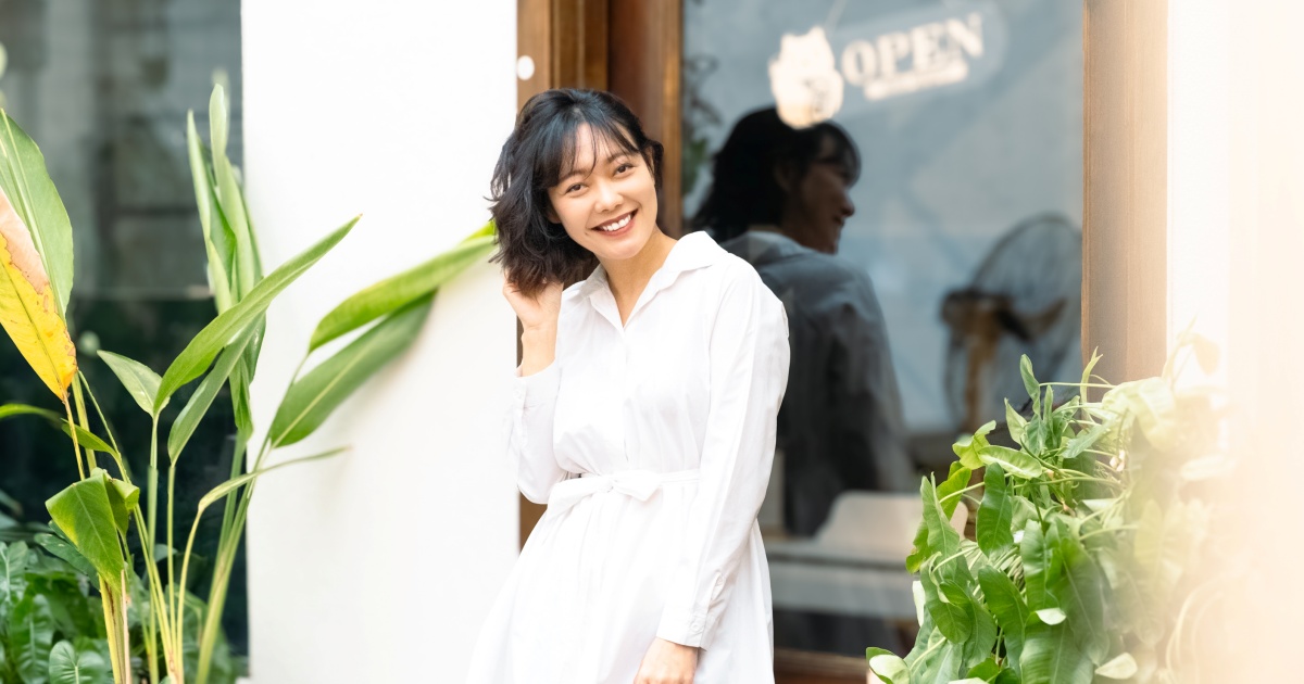 阳光之下,她扬起嘴角,露出标志性的梨涡。