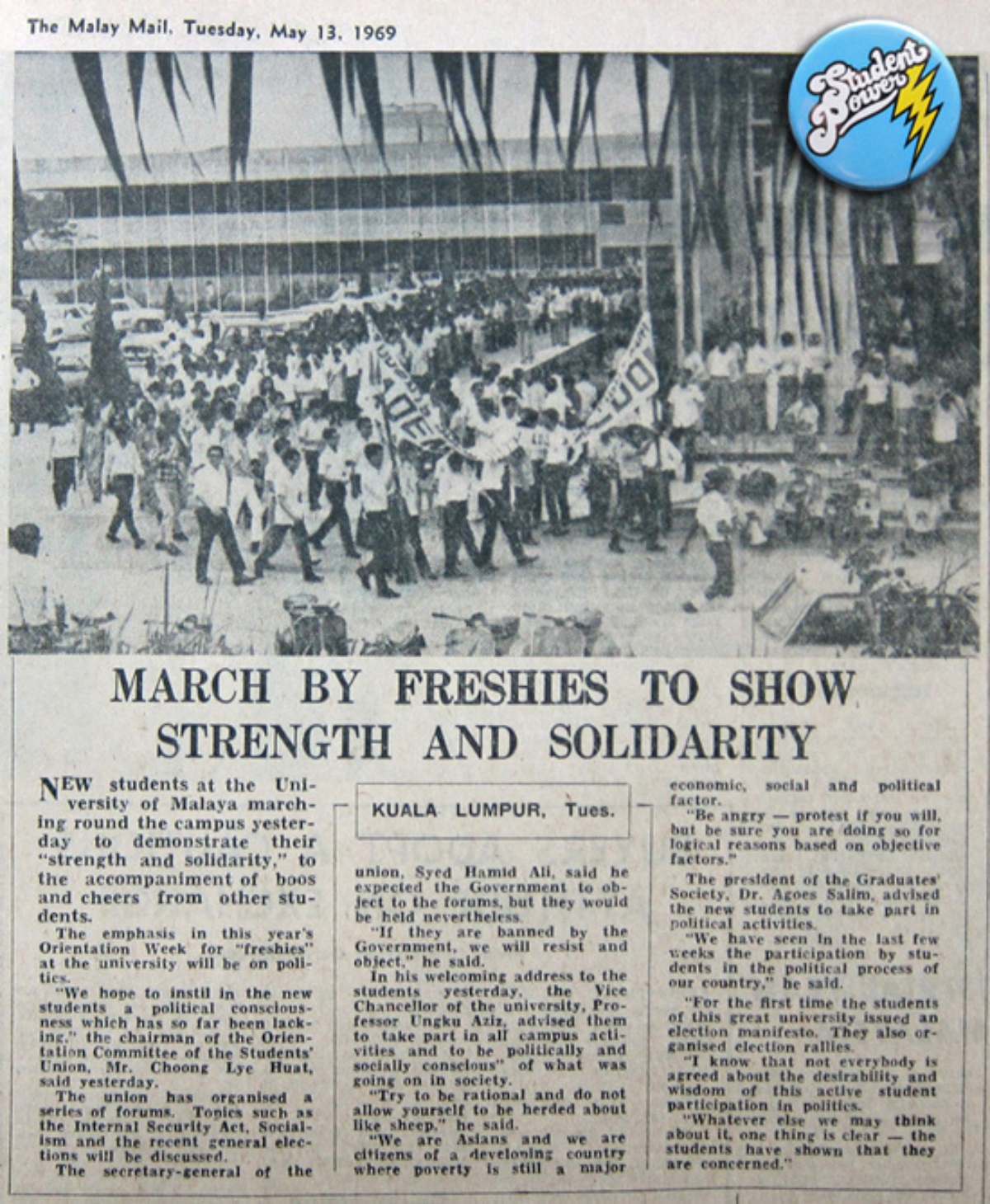 上世纪60年代至70年代初期,是国际学生运动的高峰期,马来亚大学作为全马第一学府,也处处渲染学运氛围。到马大报到那一天,谢爱萍像其他新生一样,收到学生会送的礼物——一份印着愤怒的拳头的轻薄文件夹,拳头被手铐铐住,铁链却断裂在旁。