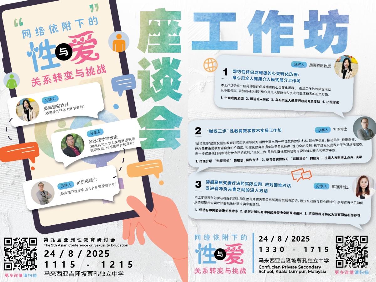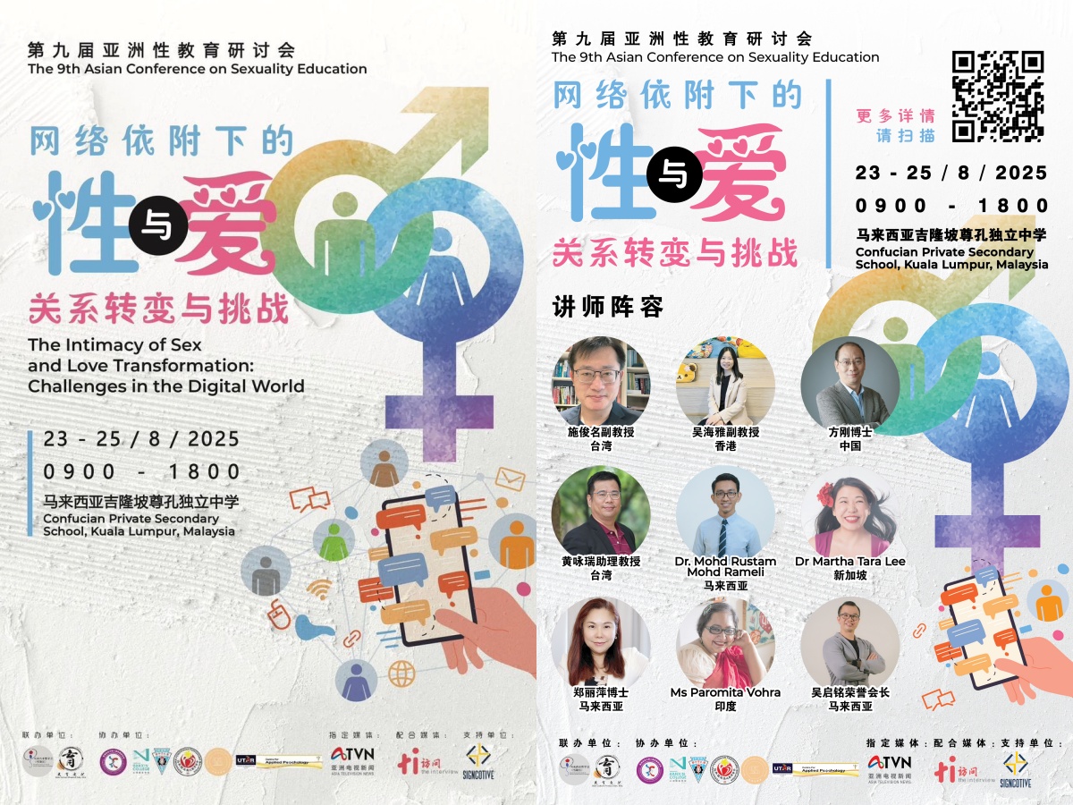 由马来西亚性学会(雪隆区)与大育文化联合主办的《第九届亚洲性教育研讨会》于2025年8月23日至24日 ,在吉隆坡尊孔独立中学举办。本届研讨会主题为“网络依附下的性与爱:关系转变与挑战” ,大会将邀请来自中国、台湾、香港、新加坡、印度及马来西亚的专家学者,共同探讨青少年网络恋爱、社交风险、性别认同、家庭沟通、银发族性健康等跨年龄群的重要议题。