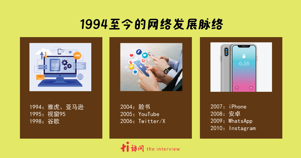 科技商业评论作家孙德俊以“AI时代”为主题,回顾了从1994年至今的互联网三个重点时期。他指出:1994年互联网商业化开启PC时代,1998年谷歌崛起统一了搜索引擎战国局面,2004年脸书与隔年的YouTube则带动了Web 2.0和社交媒体时代,社交媒体改变了人类沟通的习惯,也打破了传统媒体和大众的沟通,社交媒体也因此顺势成为新一代主流。而2007年iPhone的推出则揭开了移动互联网的序幕。如今的便利,如导航、银行应用程序、电子钱包、外卖订购,都是移动互联网所带来的变化。