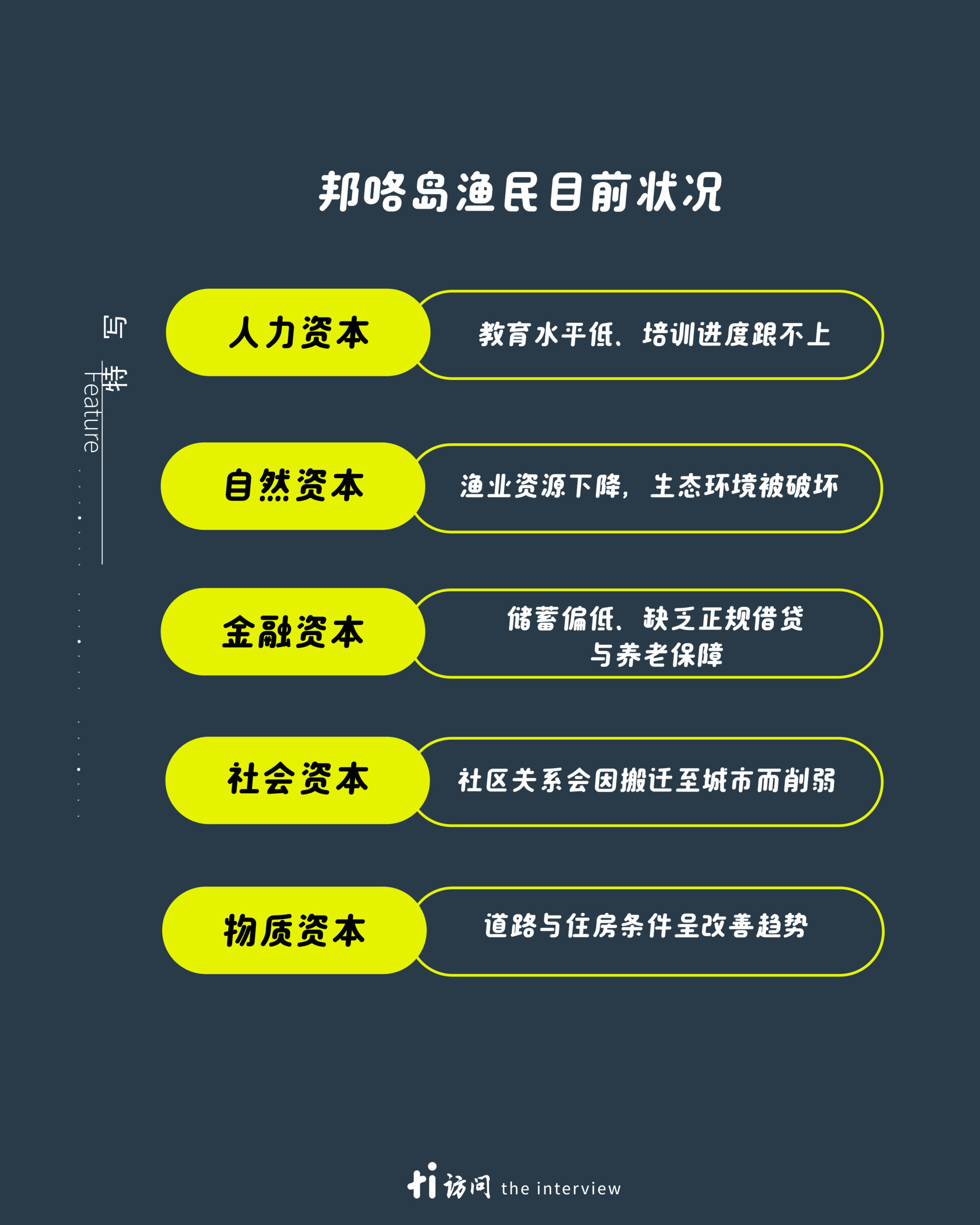 人力资本包括了当地人员培训,但由于有限的资金,渔民们得到了培训,却没有办法付上更高的成本来接纳新的技术。因为收入的不稳定,渔民的储蓄基本偏低,若是要得到更高的金融资本,则需要经过繁琐的程序来申请,因此鲜少有渔民为此付出大量的精力和时间。邦咯岛的生态体现了当地的自然资本,却需要一定的努力来平衡经济与自然环境,因此经济和生态之间的平衡仍然是一大挑战。同时,邦咯岛渔民之间关系密切,虽然政府大力推动可负担房屋,但和乡村截然不同的生活环境,让他们失去了培养邻里关系的桥梁。 尽管岛屿发展会带来不适,但何秀娘依然肯定了政府推动了当地的基本建设,保障基本生活便利,提升了岛民们的物质资本。
