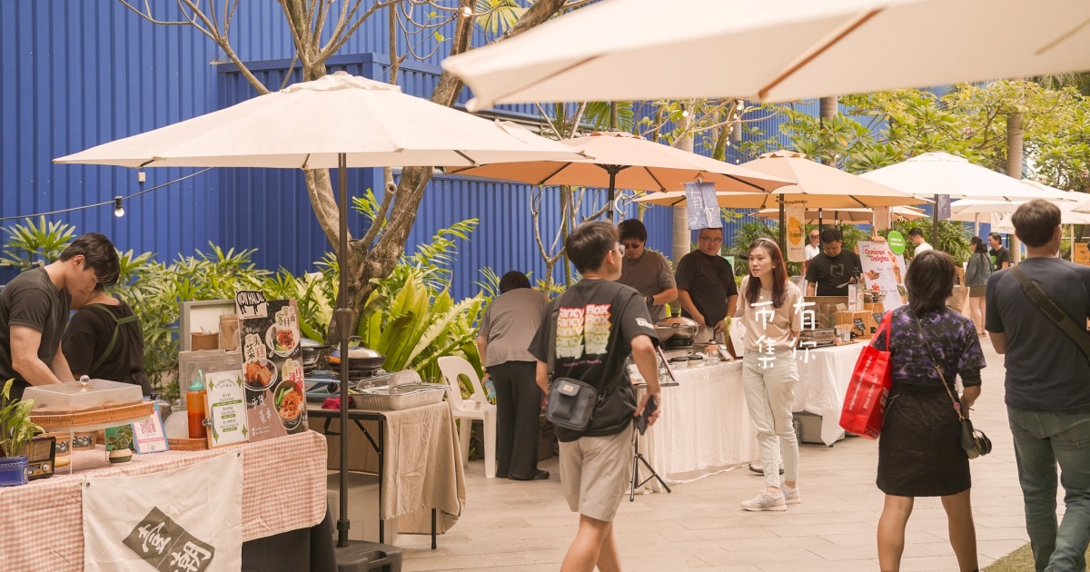 尾随他从底楼至二楼的市集逛了一圈——室内摆放遮阳伞,垂直纱布布置简单却有氛围感;主办方也没有放过一分一毫具有可能性的空间,就连MRT出入口前的空地、户外衔接桥都用上了。