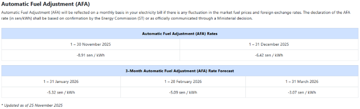 更多有关AFA的信息,以及当前AFA费率及未来三个月预估费率,可浏览:myTNB门户网站