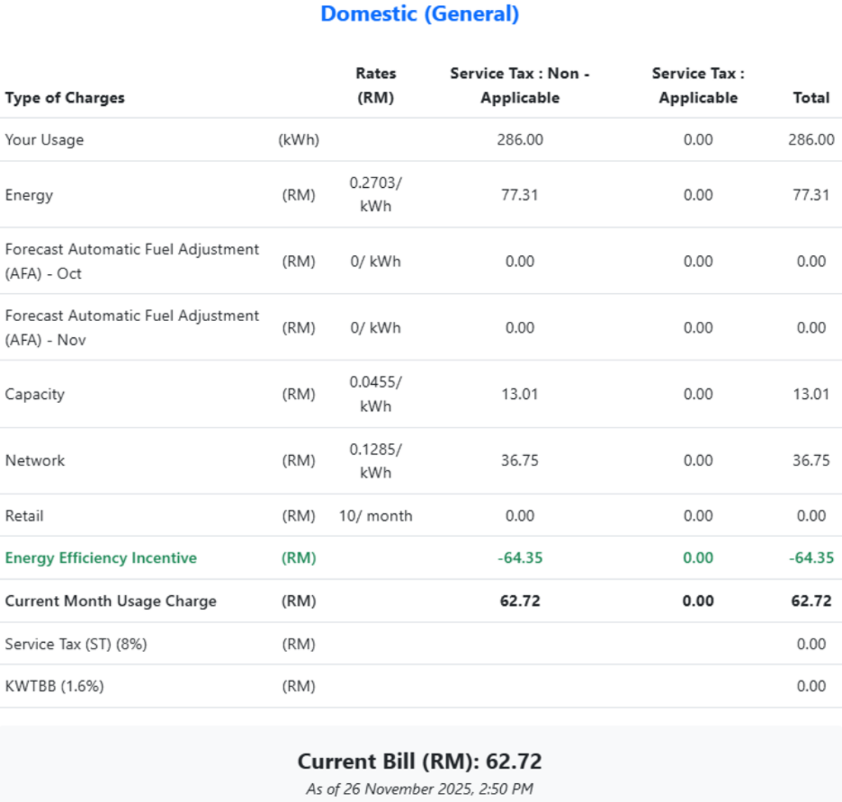 总电费=总用电量x能源费(286kWh x 27.03仙)+总用电量x AFA(286千瓦时x 0) +总用电量x 容量费(286千瓦时x 4.55仙)+总用电量x电网费(286千瓦时x12.85仙)+ 零售附加费(0,因为用电量低于600千瓦时) – 节能奖励(RM64.35) = RM62.72