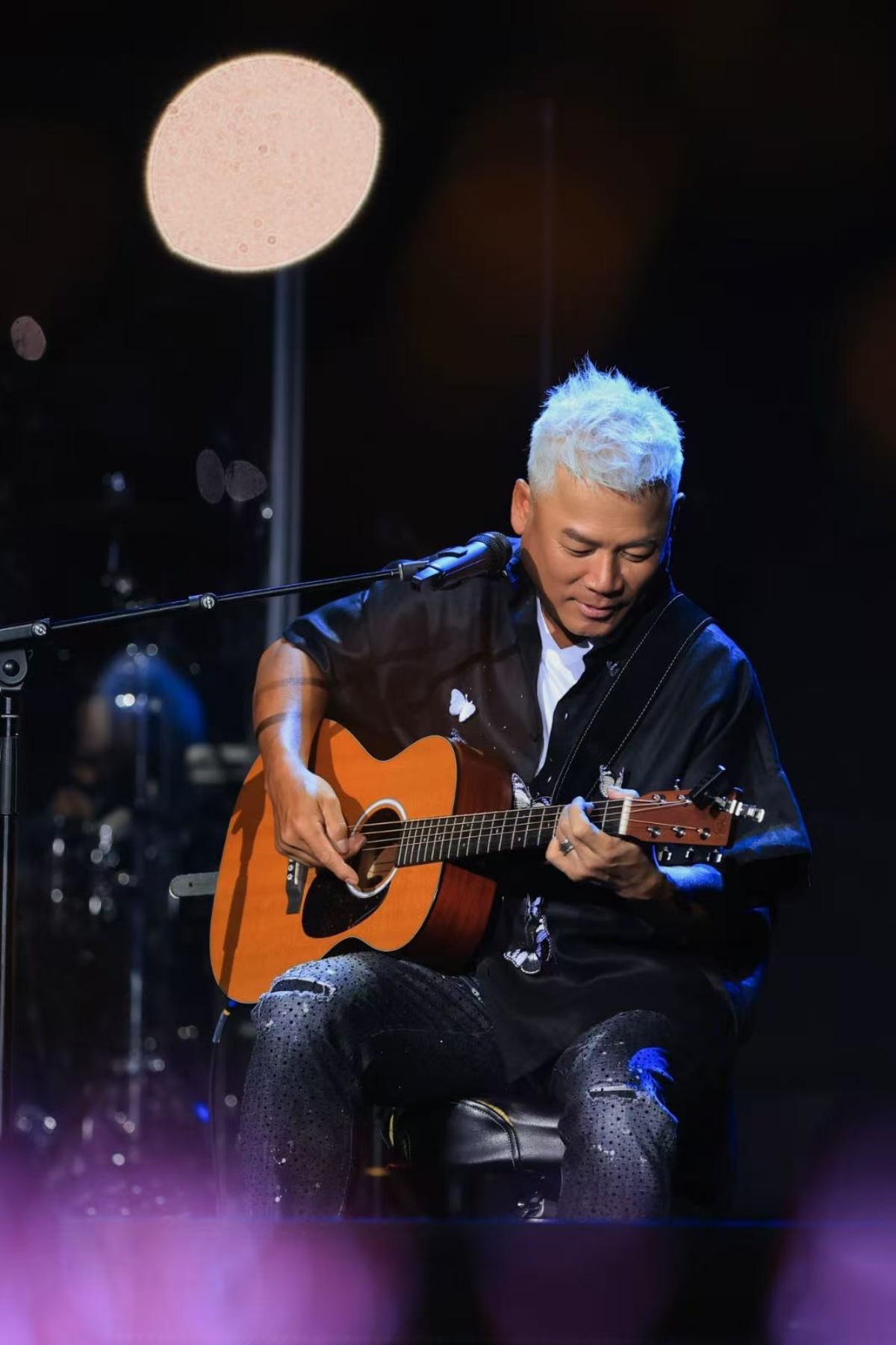 所以,就有了一段“私房歌”翻唱组曲编排。一改先前站立演唱时的澎湃气场,他接过工作人员手中的吉他,笑容满面地唱起自己的青春记忆。