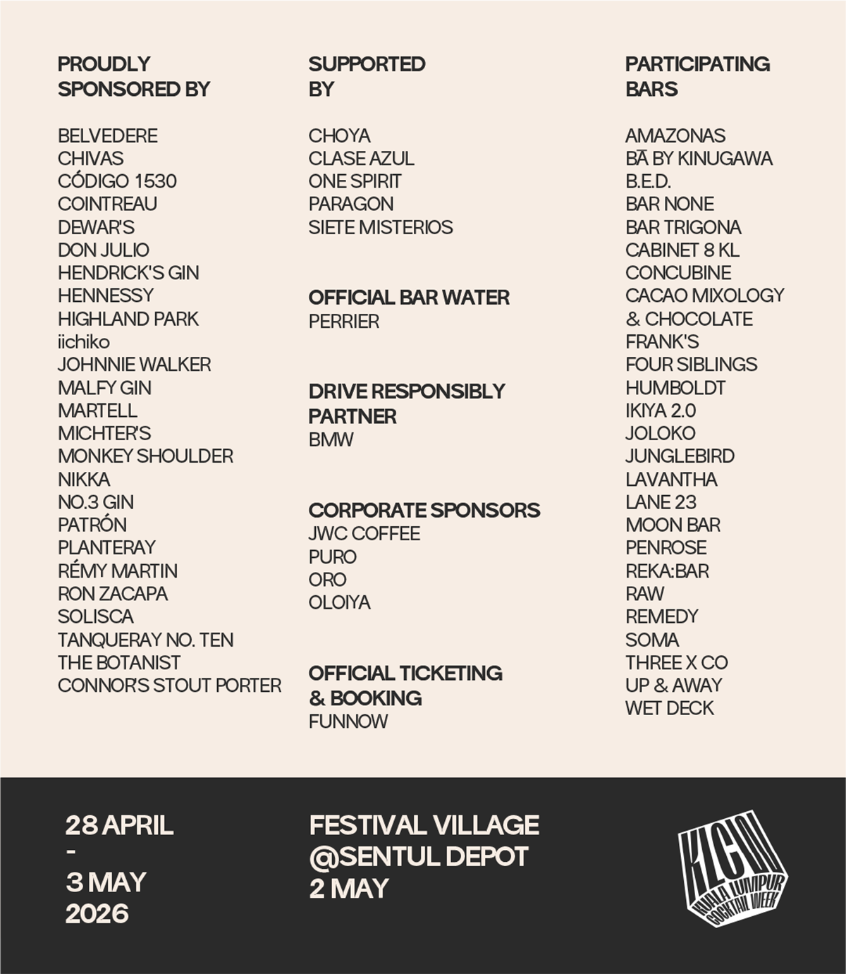 压轴嘉年华落在5月2日(星期六),从下午1时30分至晚上11时30分在Sentul Depot举行。现场将齐聚所有的参与品牌及酒吧,只需一张入门票(100令吉),就能享有各大品牌鸡尾酒体验、现场音乐演出、游戏互动、调酒大师课程,以及多元舞台表演。